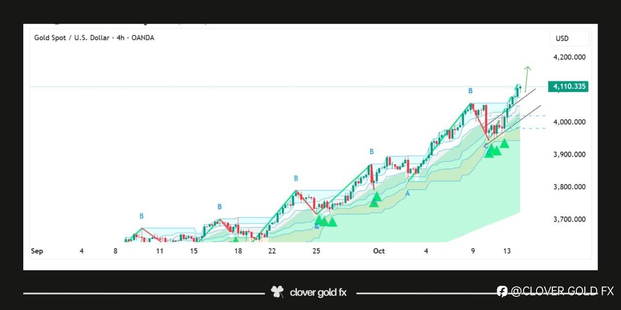 Gold in the 4Htimeframe is showing strong bullish momentum after forming a clear bullish hammer near the mid support zone this candle pattern indicated that buyers have regained control and pushed the market upward after testing lower levels the price has broken above the previous resistance zone turning it into new support which confirms continuation of the uptrend the bullish structure with higher highs and higher lows supports the idea of strength from buyers the breakout above the key level signals that market sentiment is highly positive and the next target area lies near the projected Fibonacci extension suggesting that gold may continue its rise with strong momentum as long as it stays above the breakout level and maintains bullish volume
