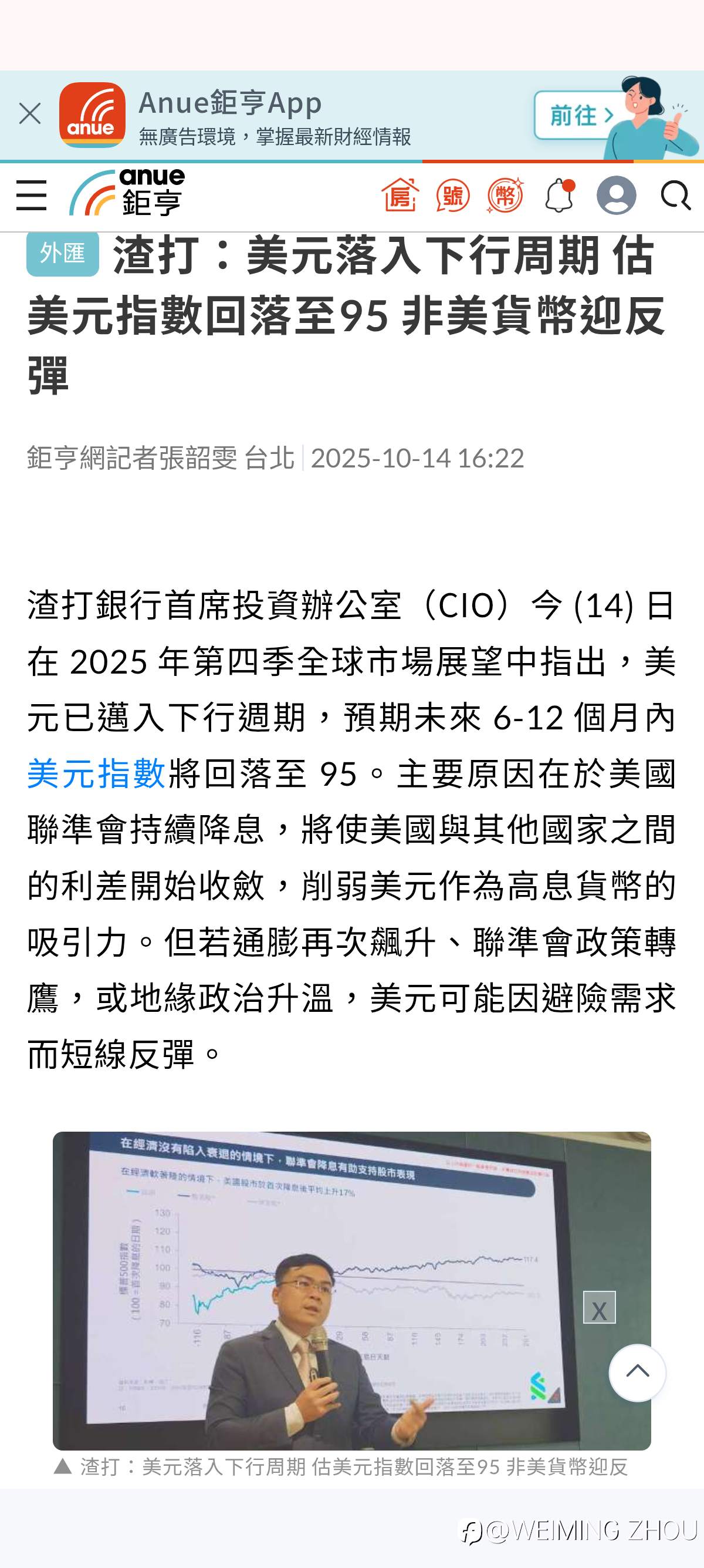 渣打銀行首席投資辦公室(CIO)今 (14) 日在 2025 年第四季全球市場展望中指出,美元已邁入下行週期,預期未來 6-12 個月內美元指數將回落至 95。 风险提示:本文所述仅代表作者个人观点,不代表 Followme 的官方立场。Followme 不对内容的准确性、完整性或可靠性作出任何保证,对于基于该内容所采取的任何行为,不承担任何责任,除非另有书面明确说明。