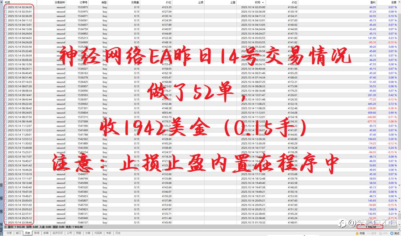 昨日(10.14)神经网络EA交易战绩: 0.15 手黄金,收1942U! AI 盯盘、秒响应,单笔最高赚 261 刀! 不用熬夜、不懂指标也能玩! 风险提示:本文所述仅代表作者个人观点,不代表 Followme 的官方立场。Followme 不对内容的准确性、完整性或可靠性作出任何保证,对于基于该内容所采取的任何行为,不承担任何责任,除非另有书面明确说明。