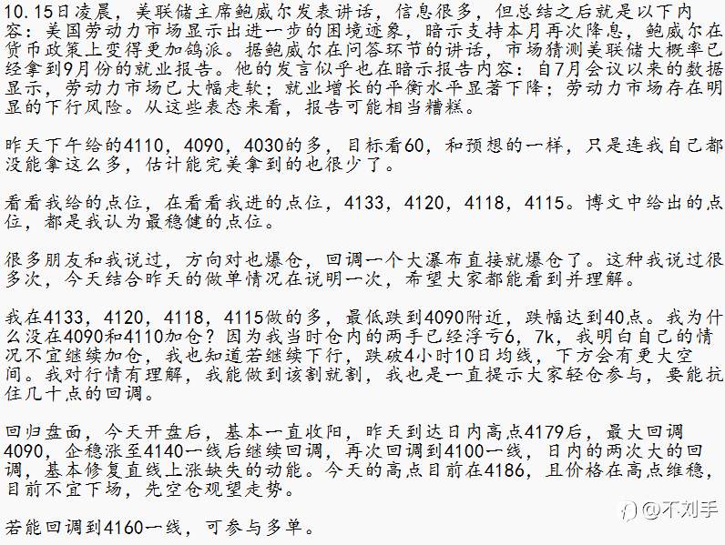 周三(10.15)日内建议 风险提示:本文所述仅代表作者个人观点,不代表 Followme 的官方立场。Followme 不对内容的准确性、完整性或可靠性作出任何保证,对于基于该内容所采取的任何行为,不承担任何责任,除非另有书面明确说明。