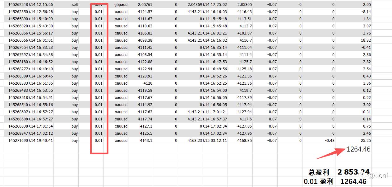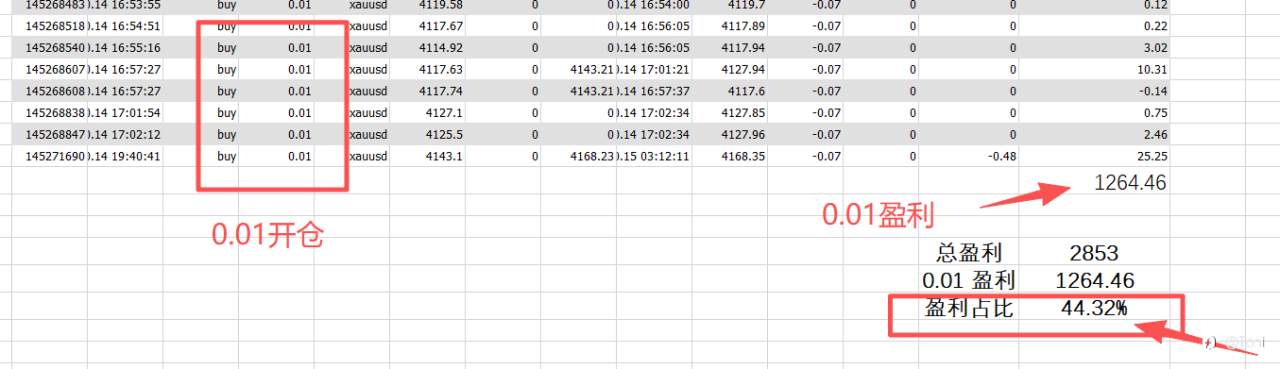 关于7# 3000美金跟单 ,很重要 : 如果跟单有条件,还是建议用整数倍跟单, 以下是 2个月账户的统计 0.01开单盈利占比总盈利超过40% 供参考 GOOD LUCY 风险提示:本文所述仅代表作者个人观点,不代表 Followme 的官方立场。Followme 不对内容的准确性、完整性或可靠性作出任何保证,对于基于该内容所采取的任何行为,不承担任何责任,除非另有书面明确说明。