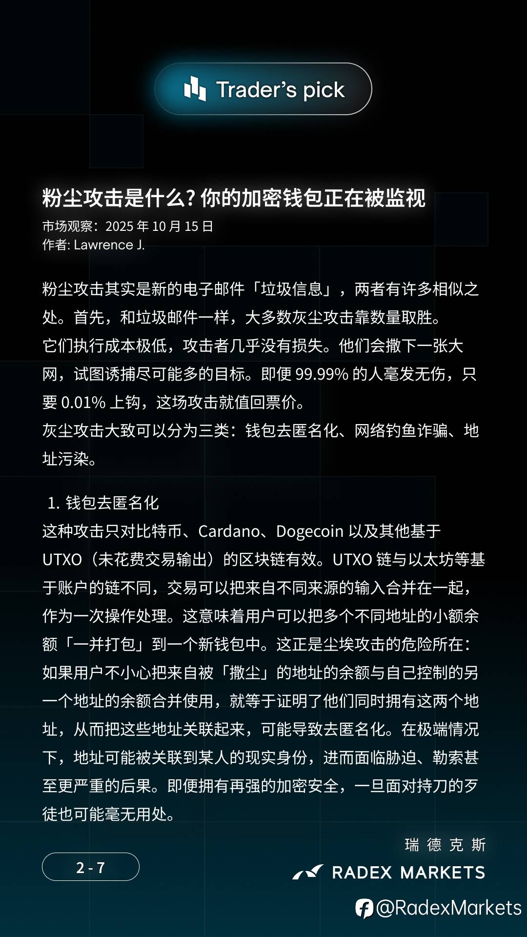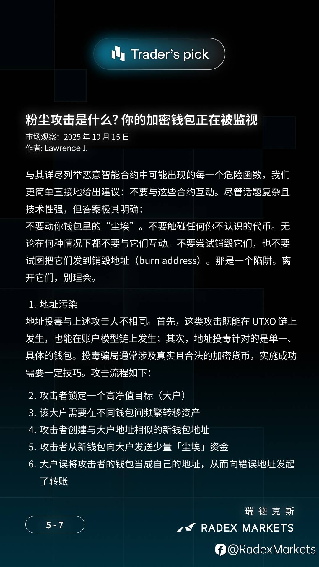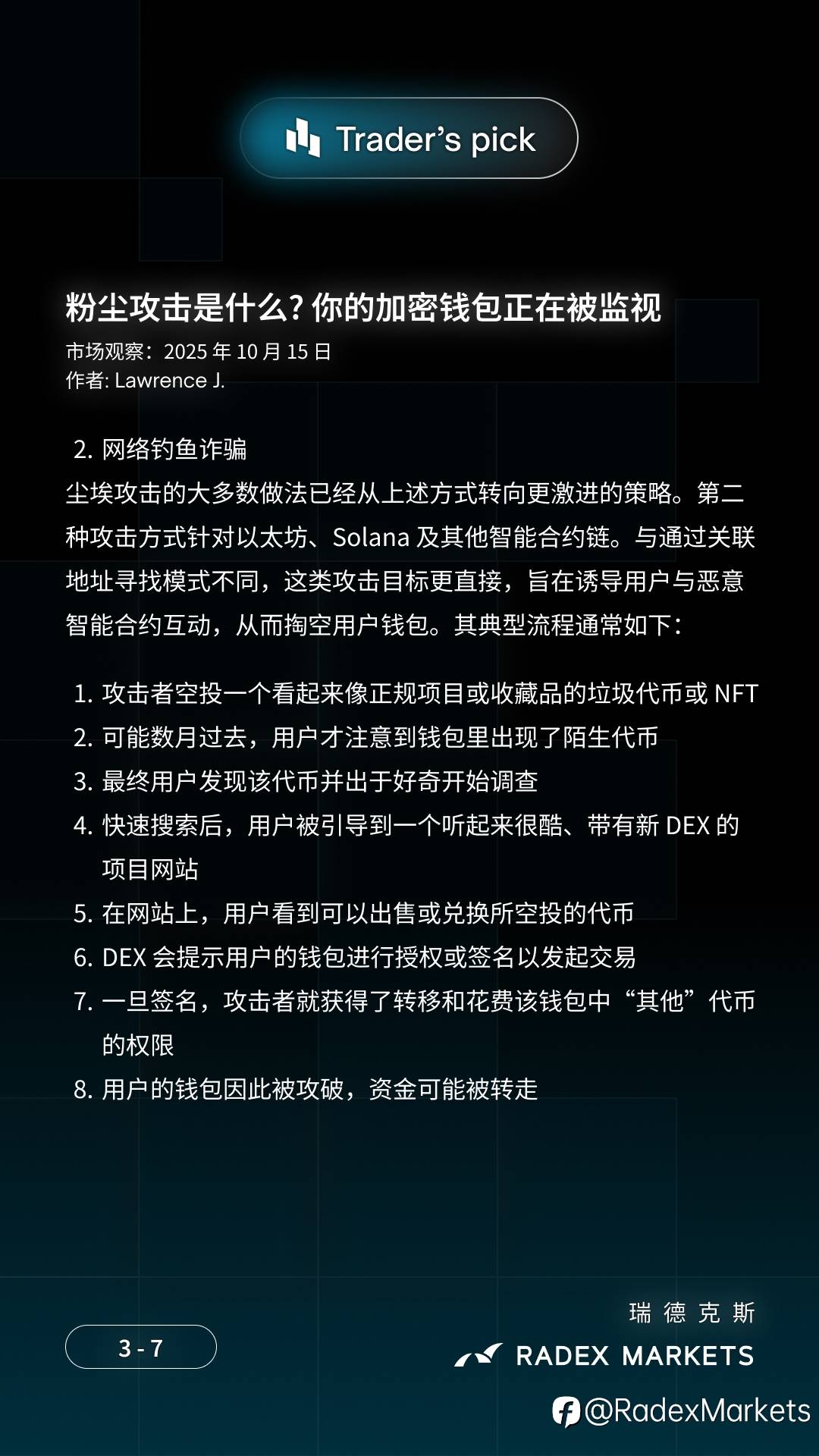 📢 粉尘攻击 🔐 你将了解到: 🔹 为什么钱包中突然出现神秘代币 🔹 自我托管用户的关键安全规则 🔹 三种粉尘攻击类型:钱包去匿名化、网络钓鱼诈骗和地址污染 文章作者:Lawrence J. 来自 #RADEXMARKETS #加密货币 #粉尘攻击 风险提示:本文所述仅代表作者个人观点,不代表 Followme 的官方立场。Followme 不对内容的准确性、完整性或可靠性作出任何保证,对于基于该内容所采取的任何行为,不承担任何责任,除非另有书面明确说明。