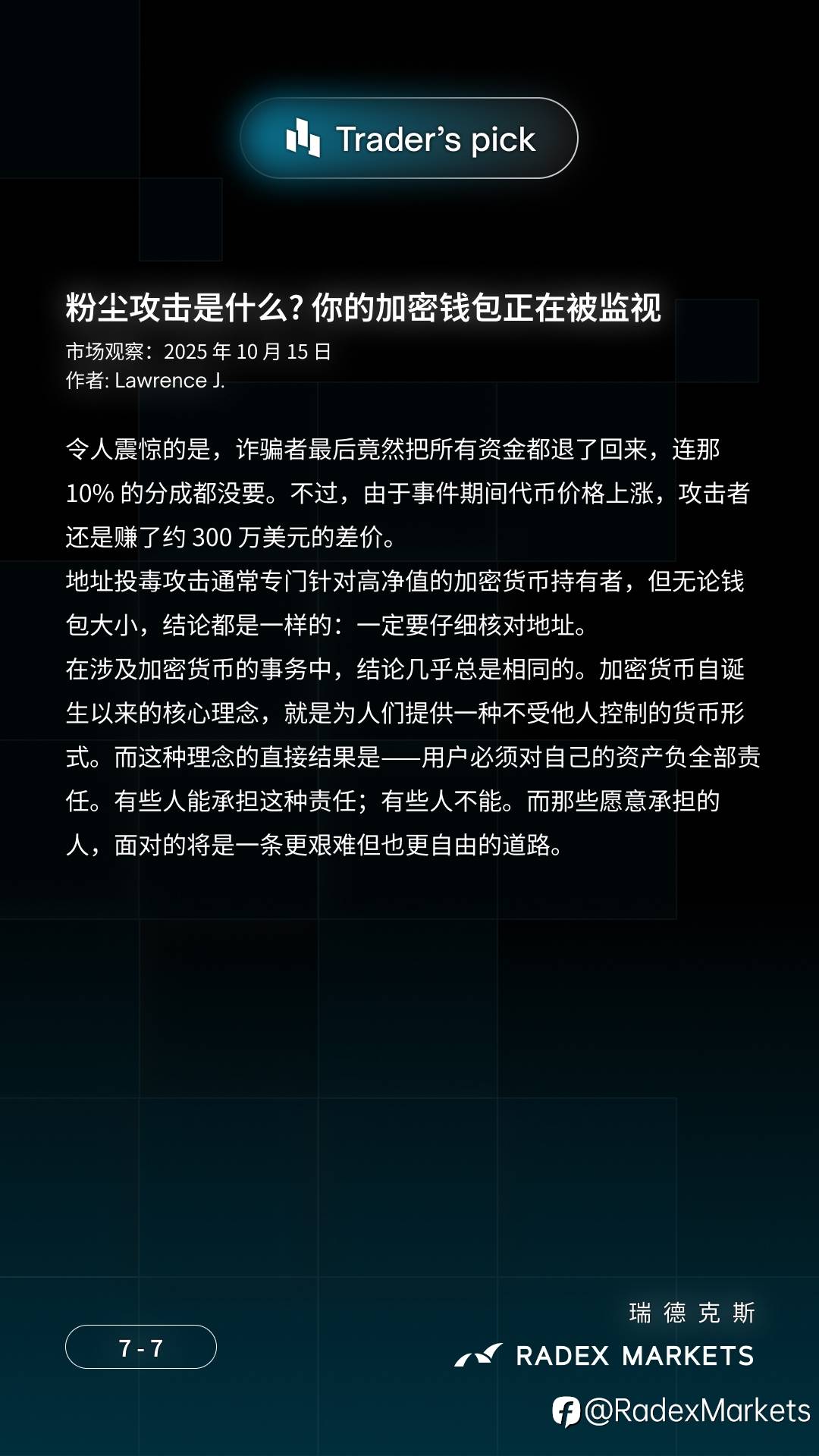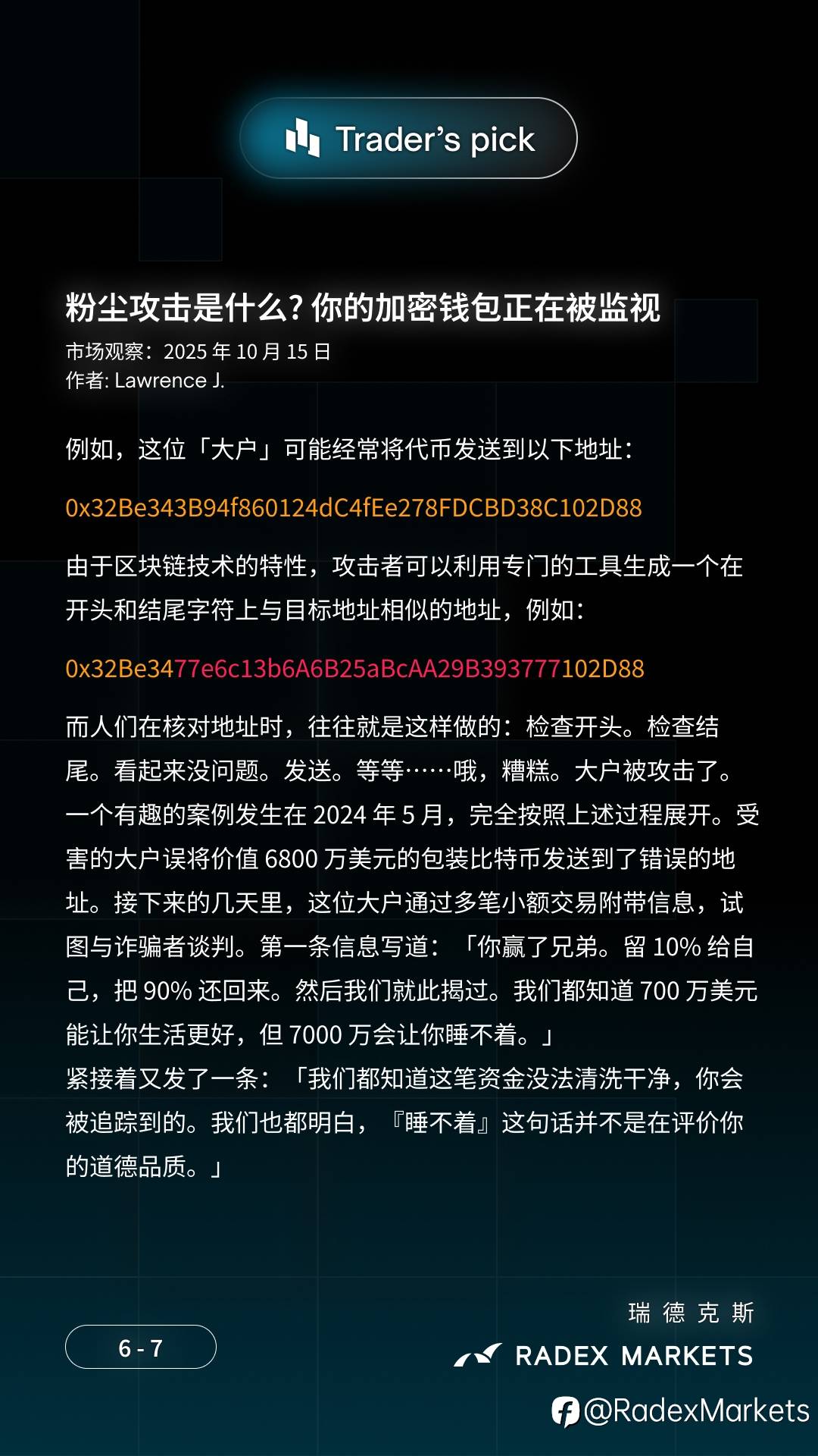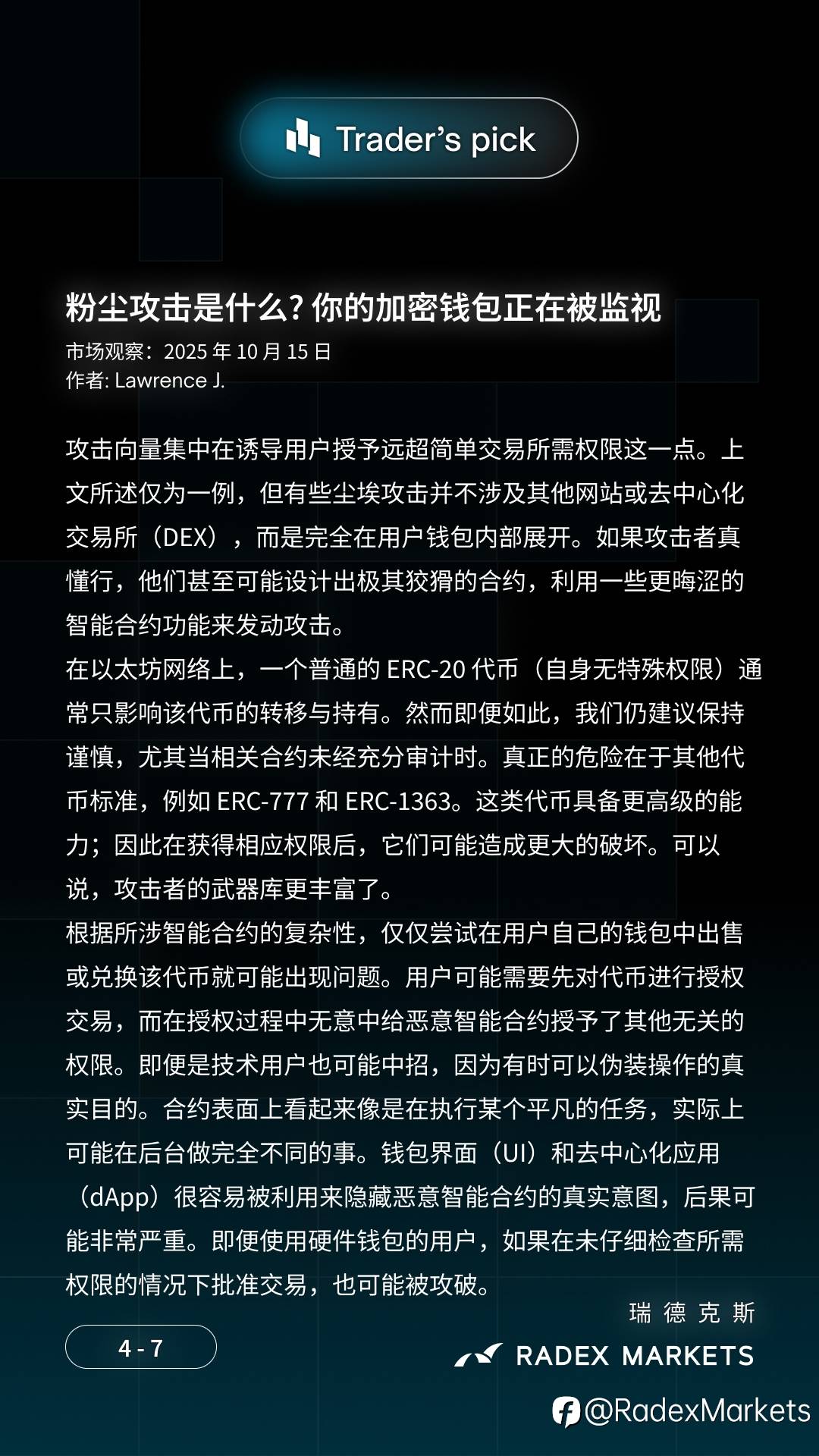 📢 粉尘攻击 🔐 你将了解到: 🔹 为什么钱包中突然出现神秘代币 🔹 自我托管用户的关键安全规则 🔹 三种粉尘攻击类型:钱包去匿名化、网络钓鱼诈骗和地址污染 文章作者:Lawrence J. 来自 #RADEXMARKETS #加密货币 #粉尘攻击 风险提示:本文所述仅代表作者个人观点,不代表 Followme 的官方立场。Followme 不对内容的准确性、完整性或可靠性作出任何保证,对于基于该内容所采取的任何行为,不承担任何责任,除非另有书面明确说明。