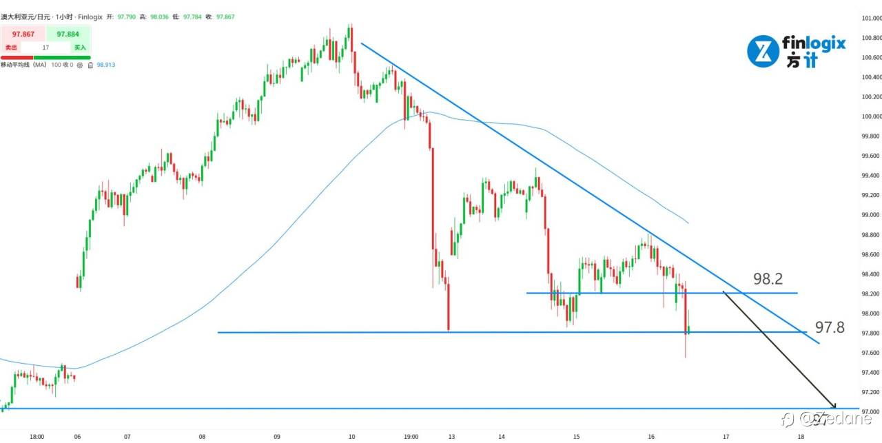 技术面:100均线向下,趋势线提供强阻力。现价触及前低点关键支撑97.8关口,早盘动能不一定阻力突破,因此交易策略以等待反弹后逢高做空为主。或者等待美盘向下突破跟随做空。