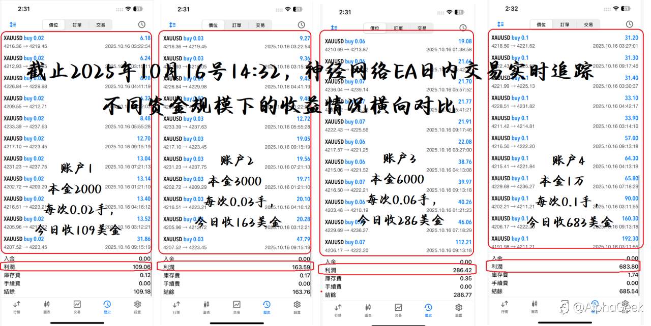 这是量化EA今日交易实录,多账户收益的横向对比 风险提示:本文所述仅代表作者个人观点,不代表 Followme 的官方立场。Followme 不对内容的准确性、完整性或可靠性作出任何保证,对于基于该内容所采取的任何行为,不承担任何责任,除非另有书面明确说明。