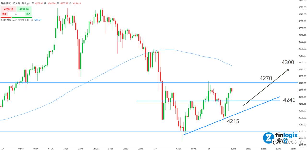 技术面: 100均线向下,多单设好止损。现价位置形成反转结构,但金价还未突破4270颈线关口,考虑到消息面反复,金价处在高位,因此暂时还是以回踩看涨为主。止损放在趋势线4215附近。4200容易出现假突破,需要等待价格站稳后再行入场多单。