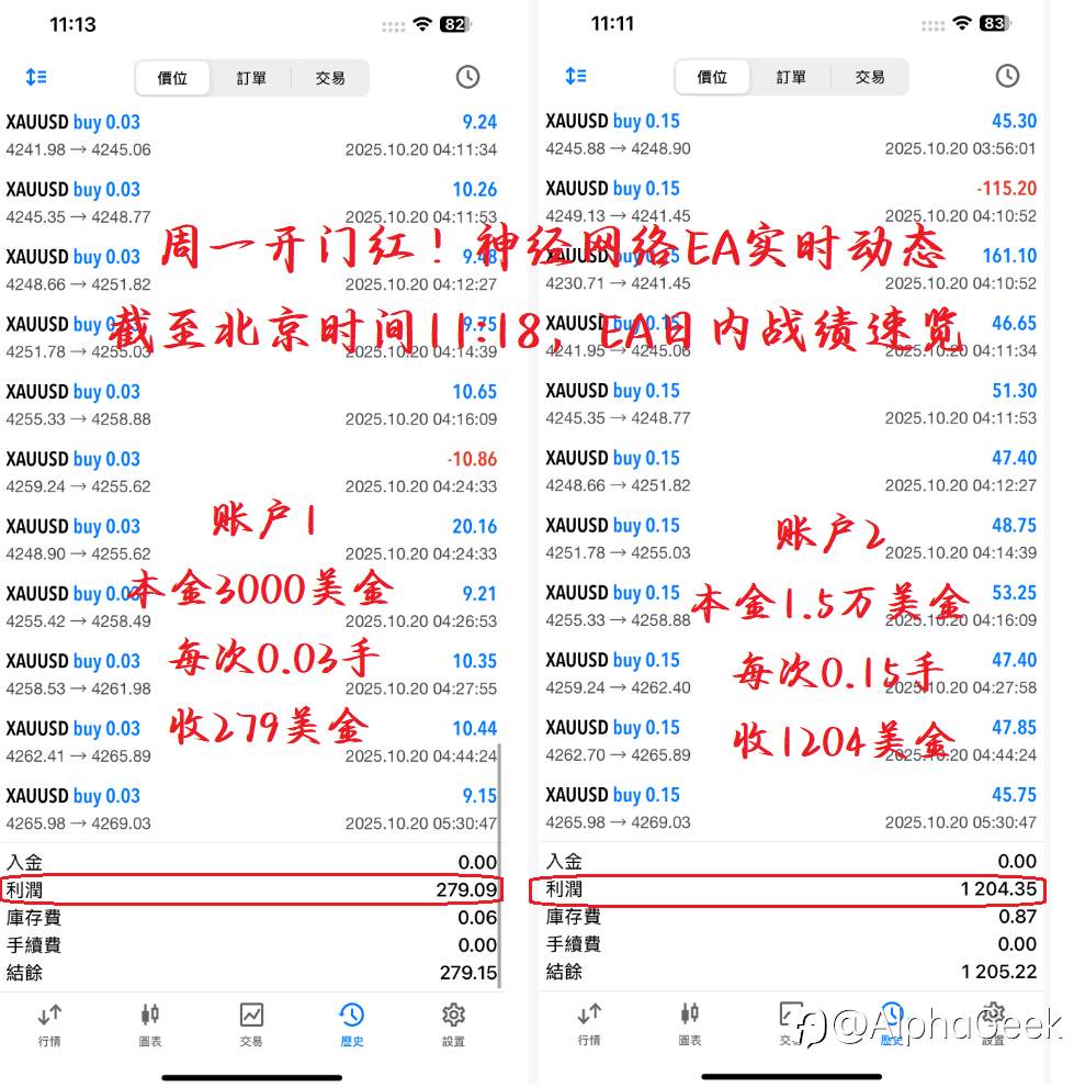 周一开门红! 截止北京时间11:18,神经网络 EA日内交易实时追踪✨ 账户 1:本金 3000 美金,每次 0.03 手操作,收获 279 美金! 账户 2:本金 1.5 万美金,每次 0.15 手操作,斩获 1204 美金! 看 EA 日内战绩,欢迎亲们找我配置~ 风险提示:本文所述仅代表作者个人观点,不代表 Followme 的官方立场。Followme 不对内容的准确性、完整性或可靠性作出任何保证,对于基于该内容所采取的任何行为,不承担任何责任,除非另有书面明确说明。