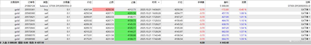 两个不同平台的 MT5 账户, 纯 EA 交易,不掺杂任何个人情感,只要掺杂个人情感,这单子真不敢拿 风险提示:本文所述仅代表作者个人观点,不代表 Followme 的官方立场。Followme 不对内容的准确性、完整性或可靠性作出任何保证,对于基于该内容所采取的任何行为,不承担任何责任,除非另有书面明确说明。