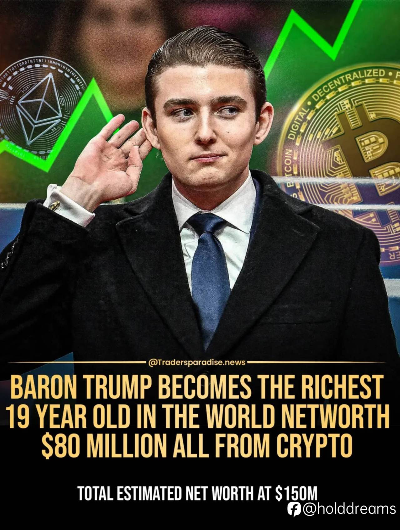 唐纳德·特朗普总统19岁的儿子巴伦·特朗普于2024年底与家人共同创立了世界自由金融加密货币项目,持有10%的股份,从代币销售和交易中获得了约8000万美元的利润。