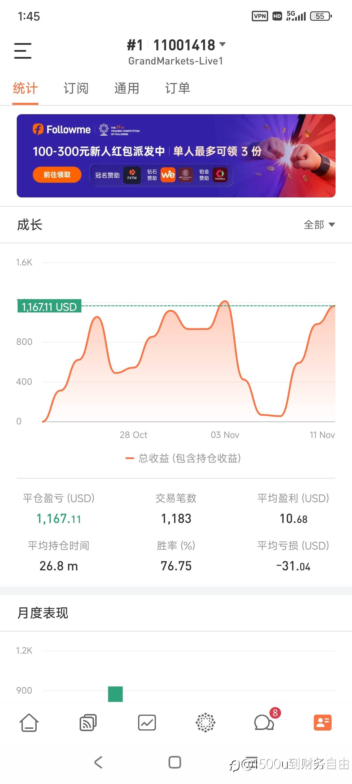 之前的1500u回调爆仓了,还好提现了1000,休息了一周多,1000u重新入金开搞,两天撸到1700u,继续冲。 风险提示:本文所述仅代表作者个人观点,不代表 Followme 的官方立场。Followme 不对内容的准确性、完整性或可靠性作出任何保证,对于基于该内容所采取的任何行为,不承担任何责任,除非另有书面明确说明。
