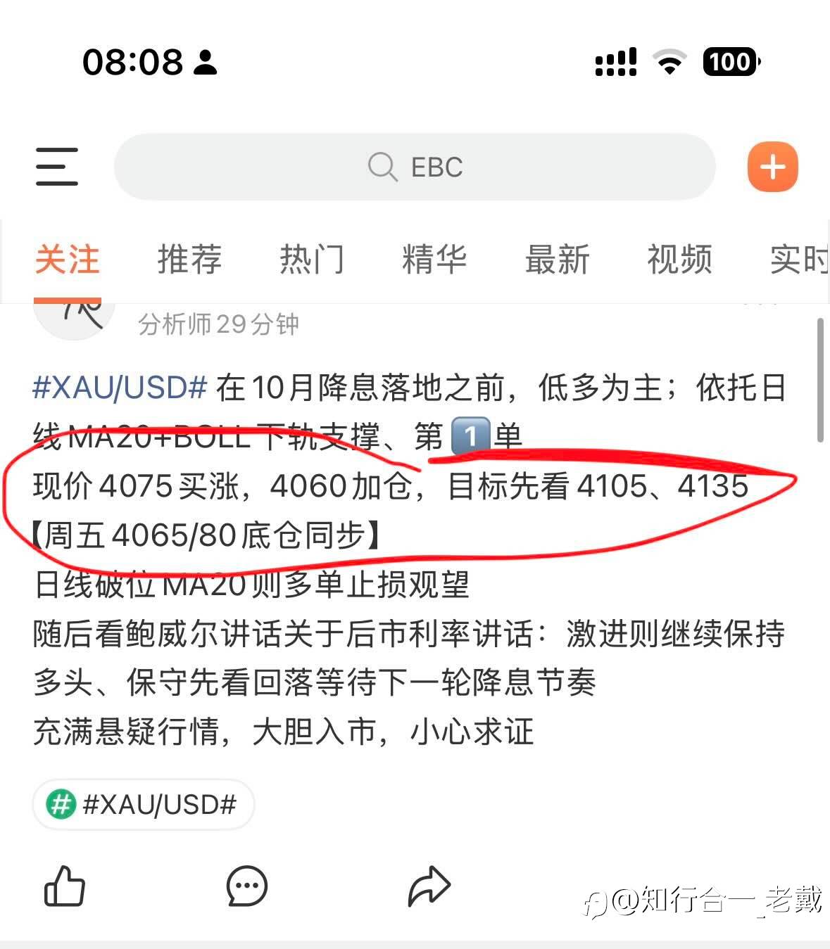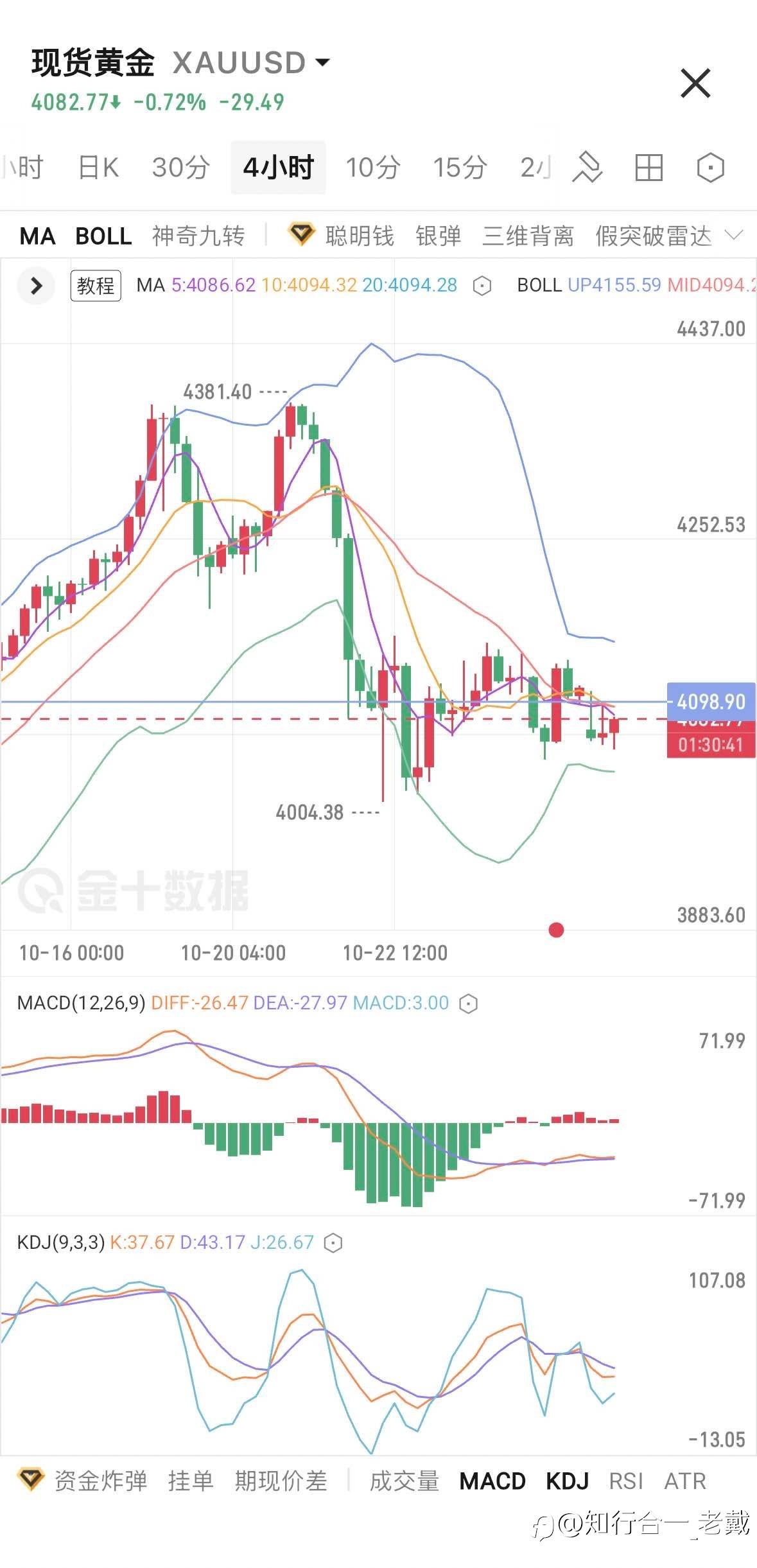 午盘黄金再次试探MA20获得支撑,符合老戴早盘思路:目前上方短线压力4100位置【4小时BOLL中轨】