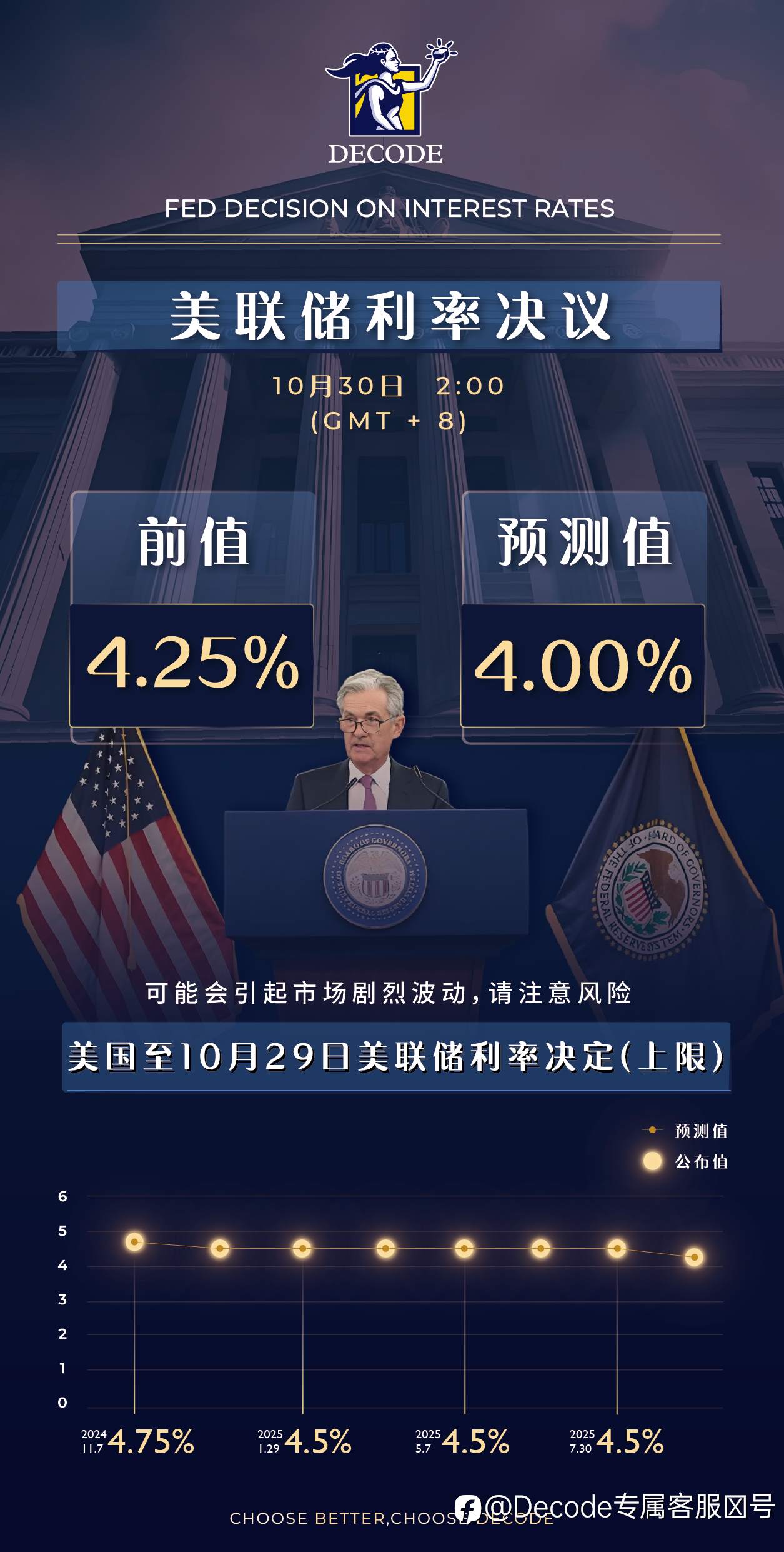 Decode Global —— —— 本周四凌晨美联储利率决议公布,市场或将迎来剧烈波动。 还请各位注意,合理控仓 Choose Better,Choose Decode ! 风险提示:本文所述仅代表作者个人观点,不代表 Followme 的官方立场。Followme 不对内容的准确性、完整性或可靠性作出任何保证,对于基于该内容所采取的任何行为,不承担任何责任,除非另有书面明确说明。
