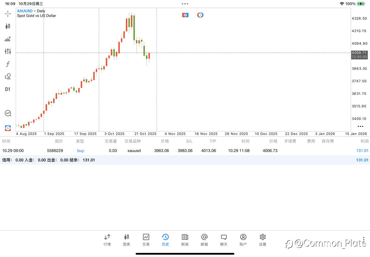10/29 盈利131.01 我对自己的交易策略极其自信,但对心态的磨练和掌控较为欠缺。 风险提示:本文所述仅代表作者个人观点,不代表 Followme 的官方立场。Followme 不对内容的准确性、完整性或可靠性作出任何保证,对于基于该内容所采取的任何行为,不承担任何责任,除非另有书面明确说明。