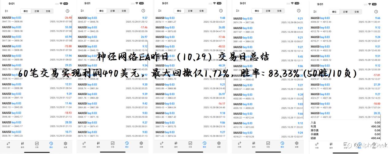 神经网络 EA 交易实录(10.29): 昨日共完成 60 笔交易,盈利 490 美元,胜率超 83% 风险提示:本文所述仅代表作者个人观点,不代表 Followme 的官方立场。Followme 不对内容的准确性、完整性或可靠性作出任何保证,对于基于该内容所采取的任何行为,不承担任何责任,除非另有书面明确说明。