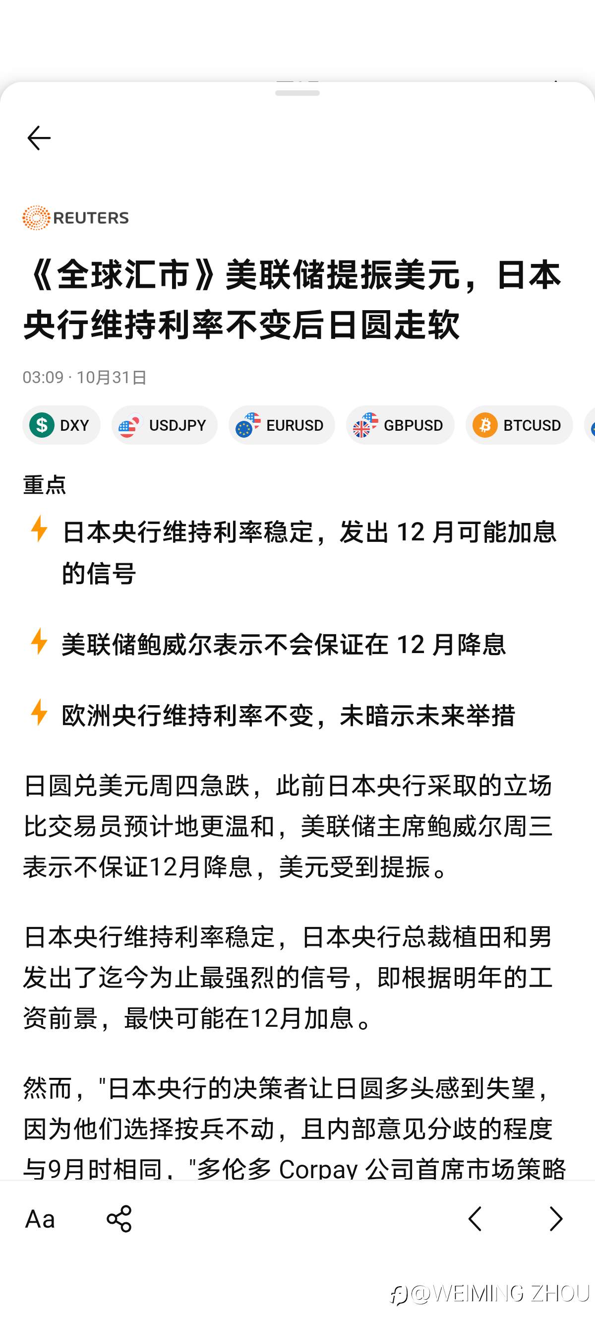 REUTERS 《全球汇市》美联储提振美元,日本央行维持利率不变后日圆走软 风险提示:本文所述仅代表作者个人观点,不代表 Followme 的官方立场。Followme 不对内容的准确性、完整性或可靠性作出任何保证,对于基于该内容所采取的任何行为,不承担任何责任,除非另有书面明确说明。
