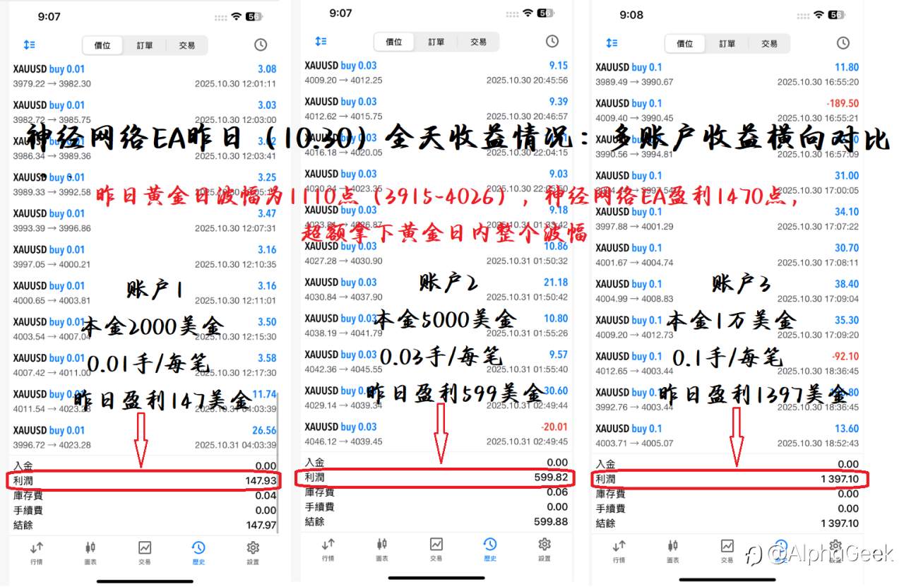 神经网络EA 10.30交易战报:单日斩获1470点收益,多账户同步告捷 账户1|本金 $2000|0.01手/笔|盈利 $147 账户2|本金 $5000|0.03手/笔|盈利 $599 账户3|本金 $10000|0.1手/笔|盈利 $1397 跑赢市场,实力印证 风险提示:本文所述仅代表作者个人观点,不代表 Followme 的官方立场。Followme 不对内容的准确性、完整性或可靠性作出任何保证,对于基于该内容所采取的任何行为,不承担任何责任,除非另有书面明确说明。
