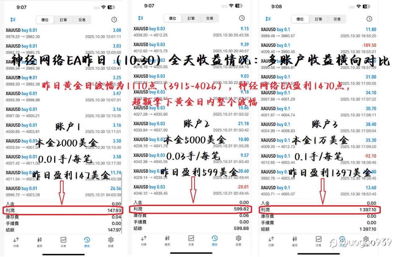 昨日(10.30),我们的神经网络EA再度展现强大实力!在黄金日波幅为1110点情况下,精准斩获1470点收益,显著跑赢市场基准。多账户策略同步验证,全额实时止盈 风险提示:本文所述仅代表作者个人观点,不代表 Followme 的官方立场。Followme 不对内容的准确性、完整性或可靠性作出任何保证,对于基于该内容所采取的任何行为,不承担任何责任,除非另有书面明确说明。