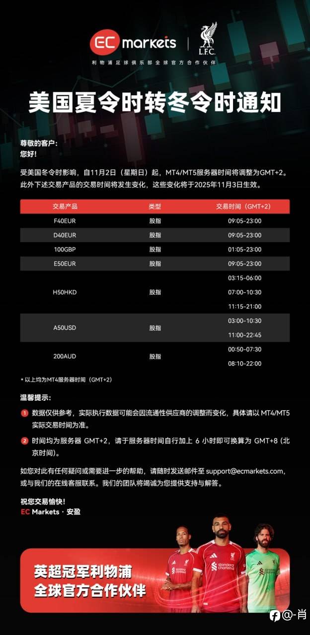 受美国冬令时影响,自11月2日(星期日)起,MT4/MT5服务器时间将调整为GMT+2。