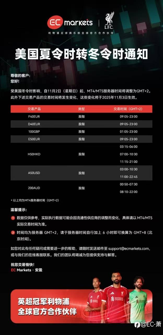 受美国冬令时影响,自11月2日(星期日)起,MT4/MT5服务器时间将调整为GMT+2。