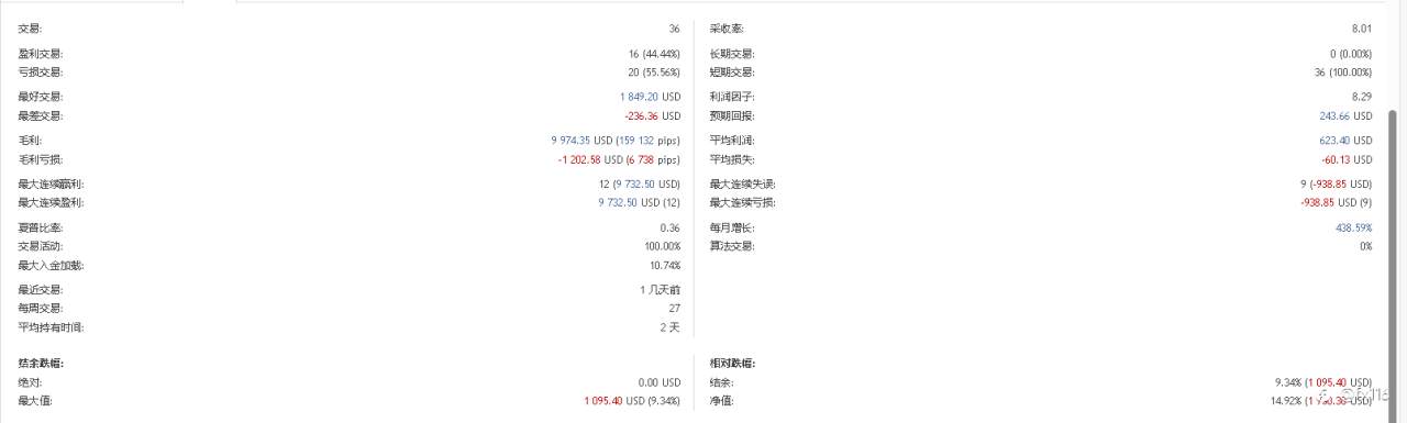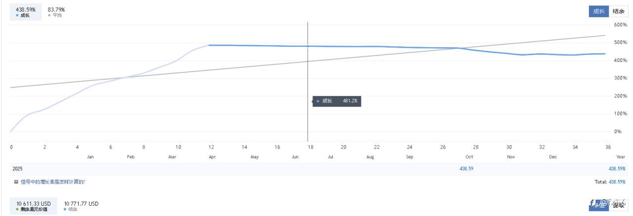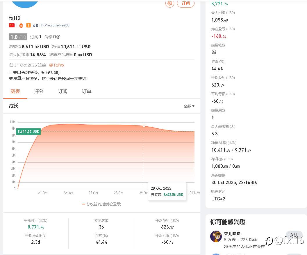10月份已结,入金账户1000美金,首月利润翻9倍, 斩获收益8611美金,最大回辙率15%有点偏高; 目前净值10611美金 11月份继续加油,保持稳定的盈利! 风险提示:本文所述仅代表作者个人观点,不代表 Followme 的官方立场。Followme 不对内容的准确性、完整性或可靠性作出任何保证,对于基于该内容所采取的任何行为,不承担任何责任,除非另有书面明确说明。