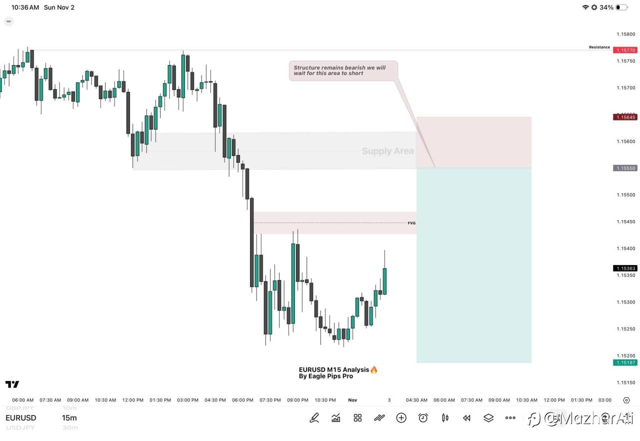 Price is now retracing back toward a key supply area, aligned perfectly with an FVG imbalance around 1.1550–1.1565 zone.