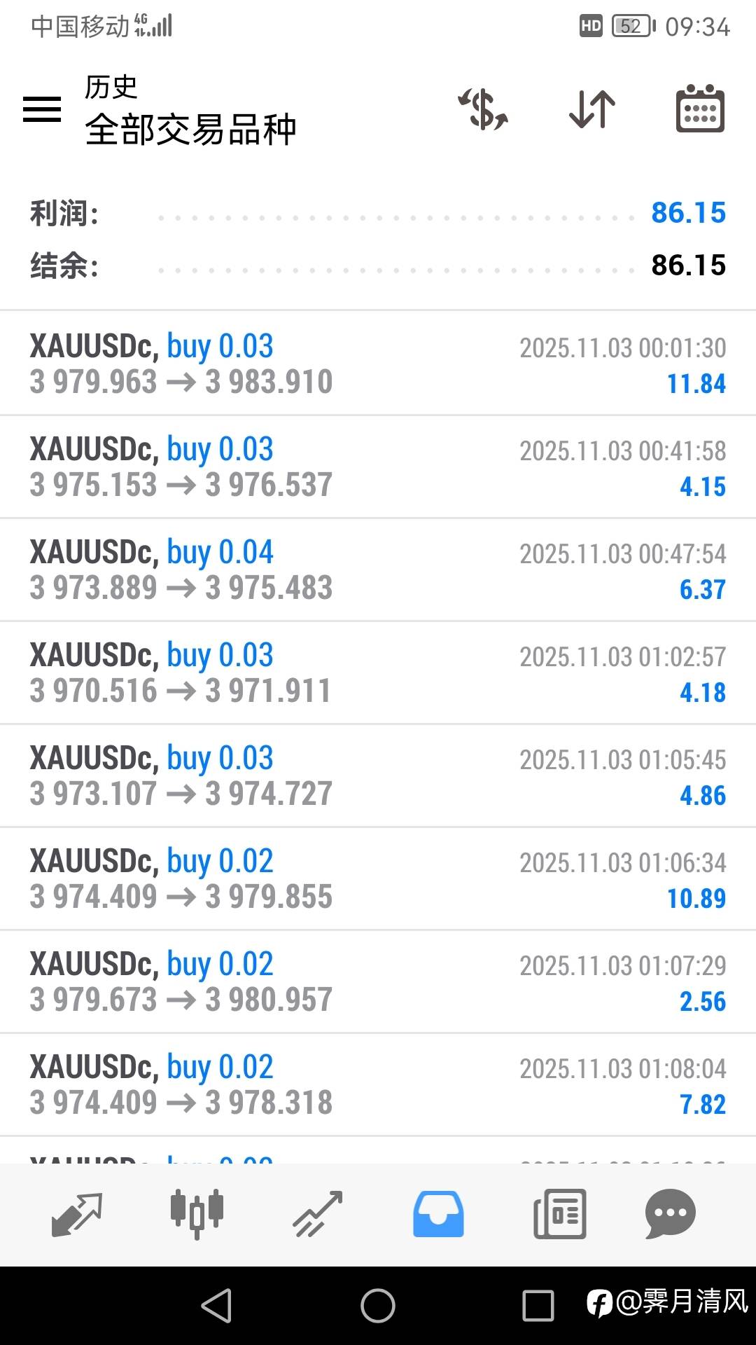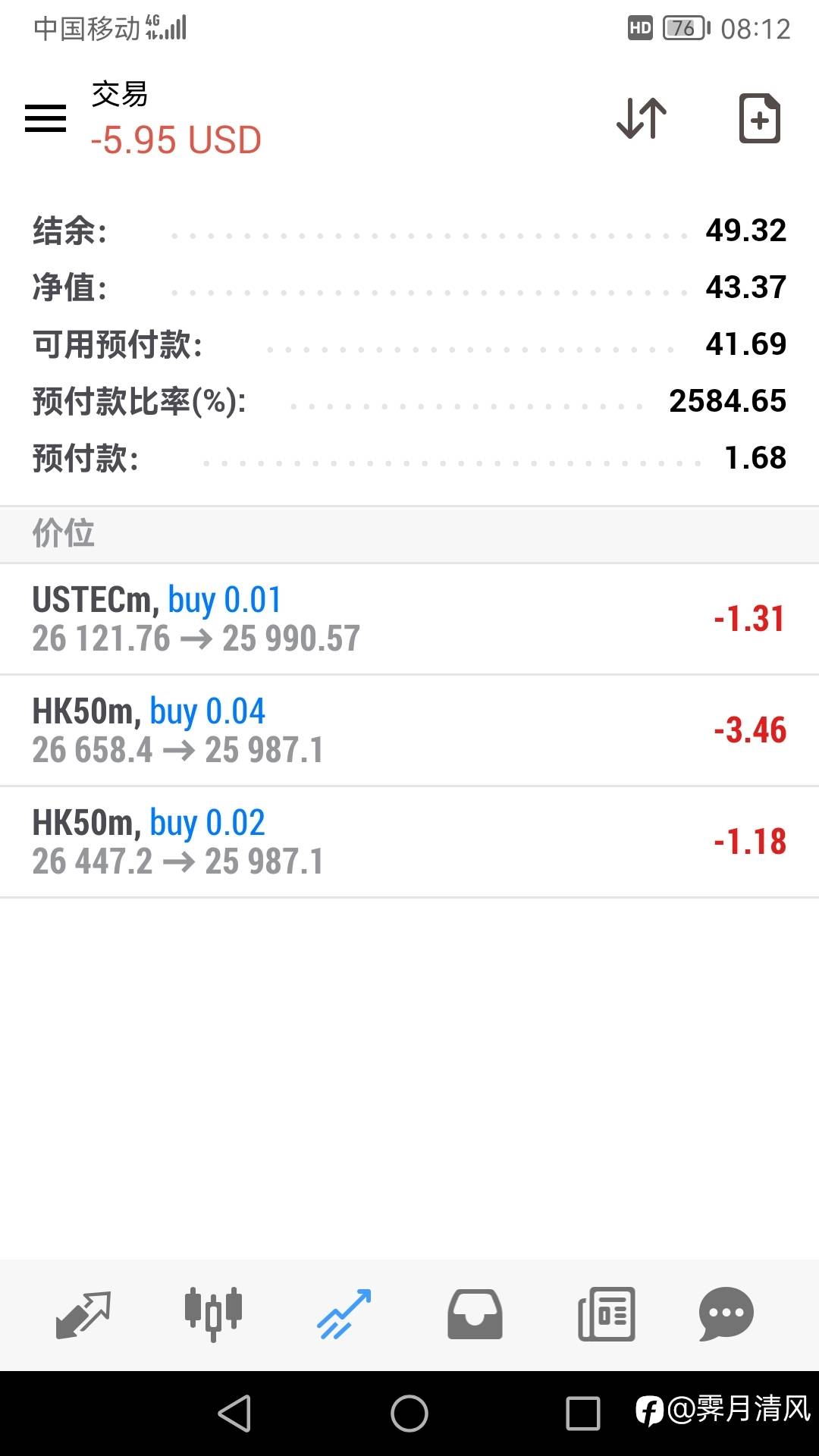 美分户10.3039美元做到今天24.0144美元,33天133%,专做黄金,日均4%。美元账户专做股指,今天兼职做黄金。损失24美元。要吸取经验教训。 风险提示:本文所述仅代表作者个人观点,不代表 Followme 的官方立场。Followme 不对内容的准确性、完整性或可靠性作出任何保证,对于基于该内容所采取的任何行为,不承担任何责任,除非另有书面明确说明。