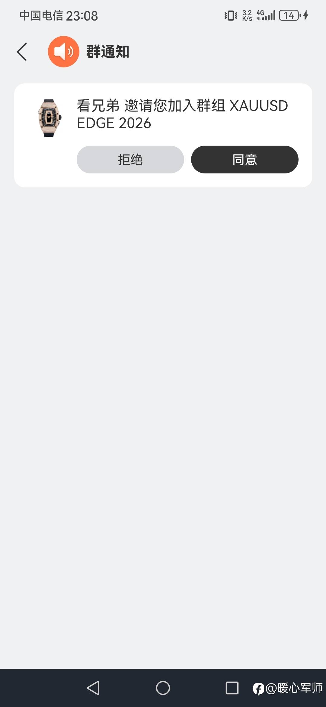 各位做交易的兄弟姐妹们!要注意了! 所谓的邀请! 手表⌚️群! 之前也是一个手表⌚️群,进群后就开始用钉钉二维码拉人进群!连环套! 多的就不说了!别信陌生群!别用自己的钱买教训! 风险提示:本文所述仅代表作者个人观点,不代表 Followme 的官方立场。Followme 不对内容的准确性、完整性或可靠性作出任何保证,对于基于该内容所采取的任何行为,不承担任何责任,除非另有书面明确说明。