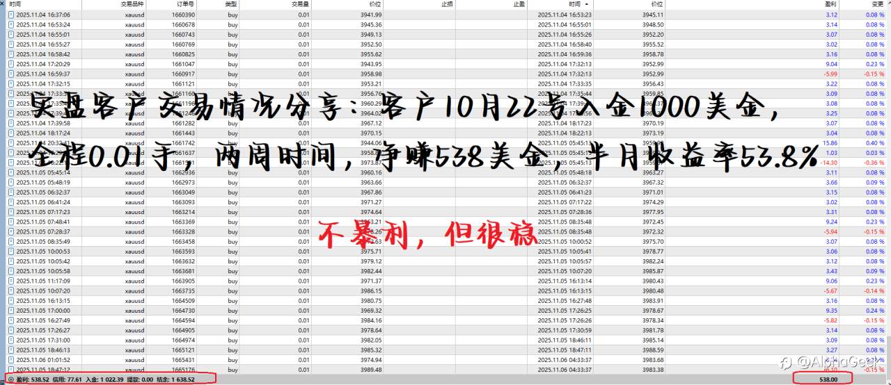 实盘客户收益情况分享: 客户10月22号入金1000美金,两周左右净赚538美金,半月收益率高达53.8%!恭喜赚钱! 这款神经网络EA 不暴利,但很稳,可自己管理,也可以免费代挂!欢迎亲们找我配置 风险提示:本文所述仅代表作者个人观点,不代表 Followme 的官方立场。Followme 不对内容的准确性、完整性或可靠性作出任何保证,对于基于该内容所采取的任何行为,不承担任何责任,除非另有书面明确说明。