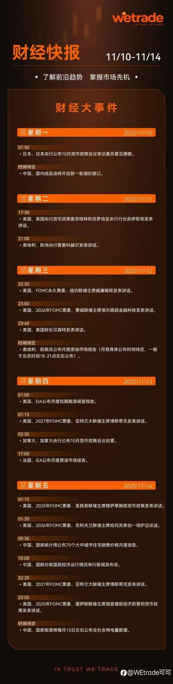 Wetrade众汇可可邀请您关注:本周财经数据+财经大事件+EIA数据 风险提示:本文所述仅代表作者个人观点,不代表 Followme 的官方立场。Followme 不对内容的准确性、完整性或可靠性作出任何保证,对于基于该内容所采取的任何行为,不承担任何责任,除非另有书面明确说明。