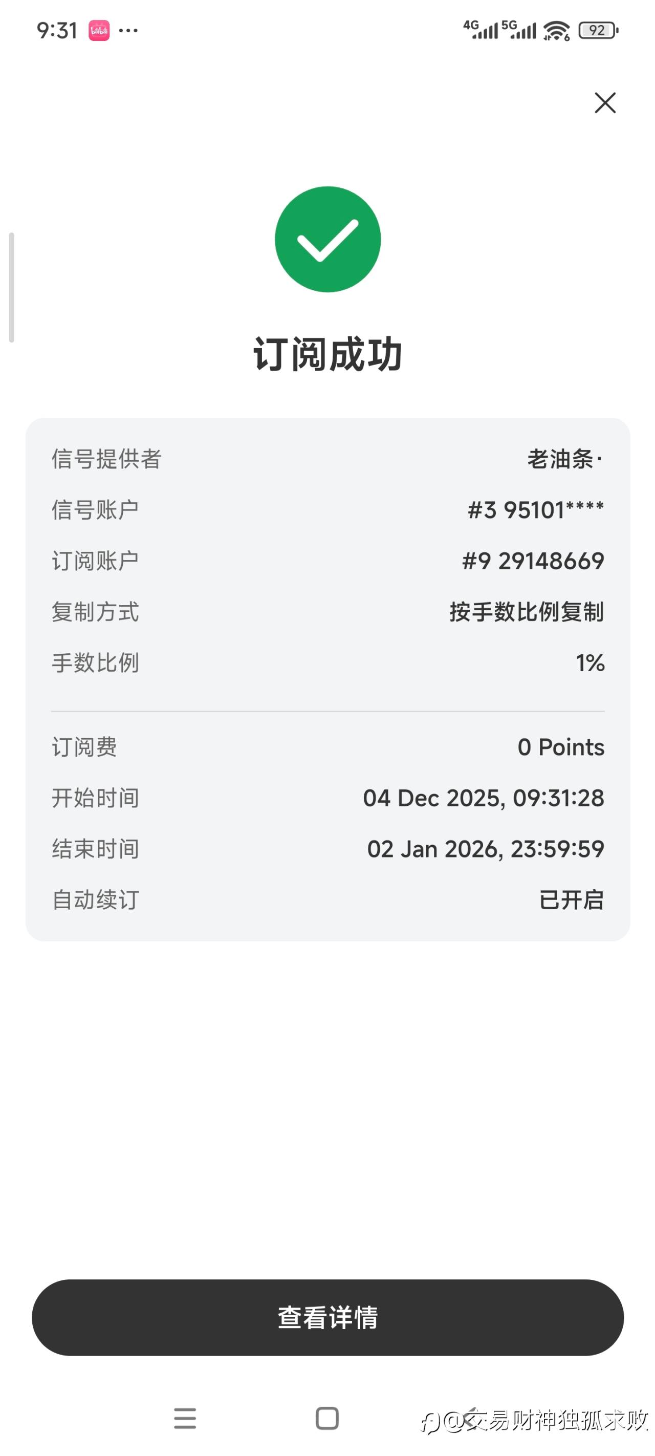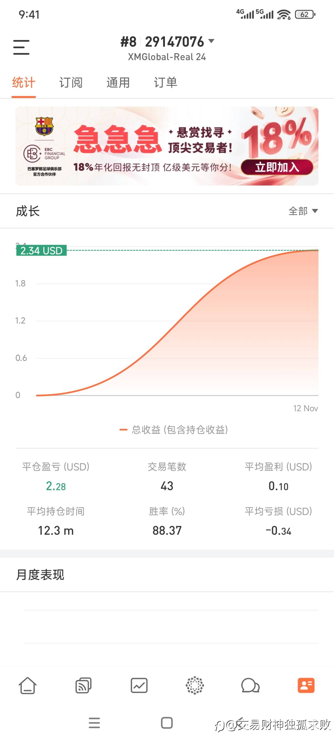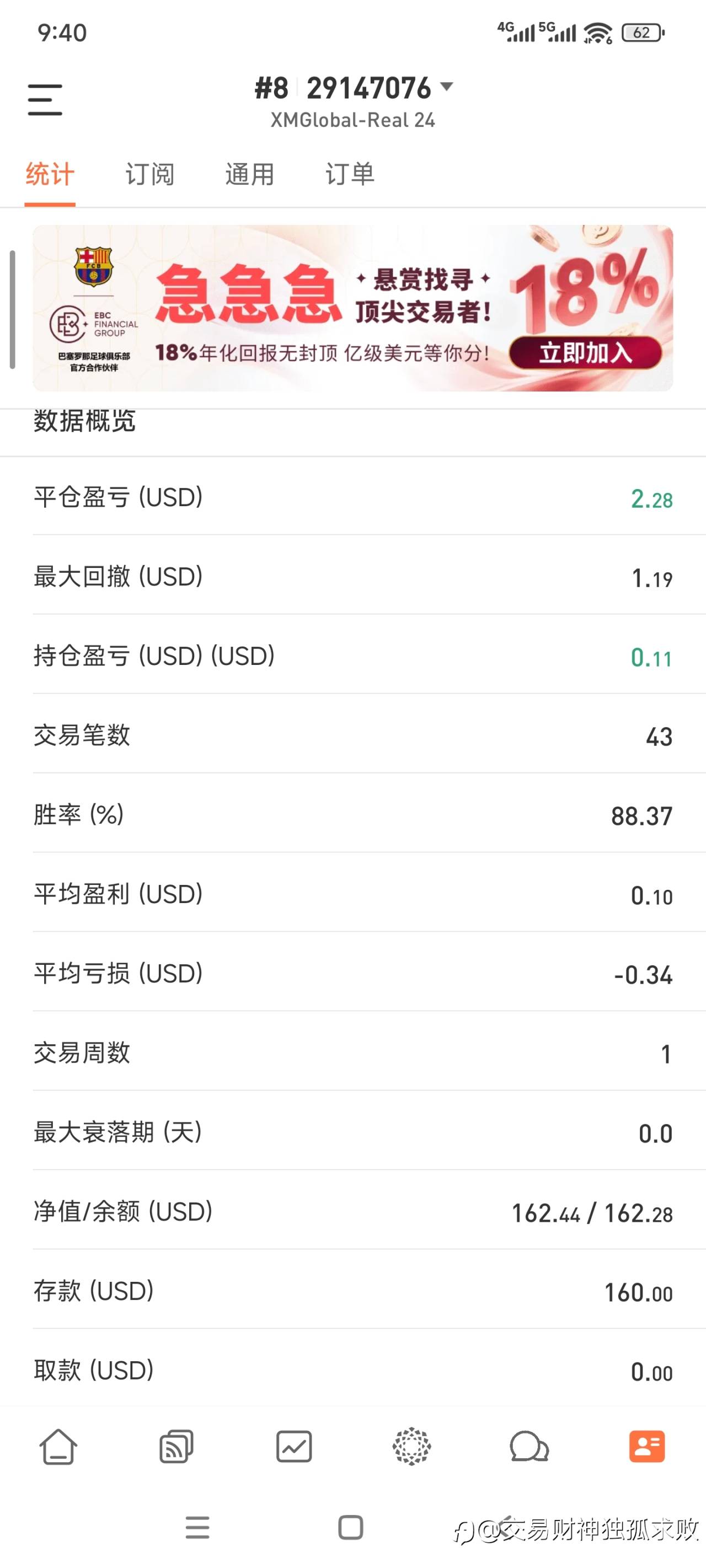 29147076第一天做单,本金160, 已做43单,净值增长到162刀。 风险提示:本文所述仅代表作者个人观点,不代表 Followme 的官方立场。Followme 不对内容的准确性、完整性或可靠性作出任何保证,对于基于该内容所采取的任何行为,不承担任何责任,除非另有书面明确说明。