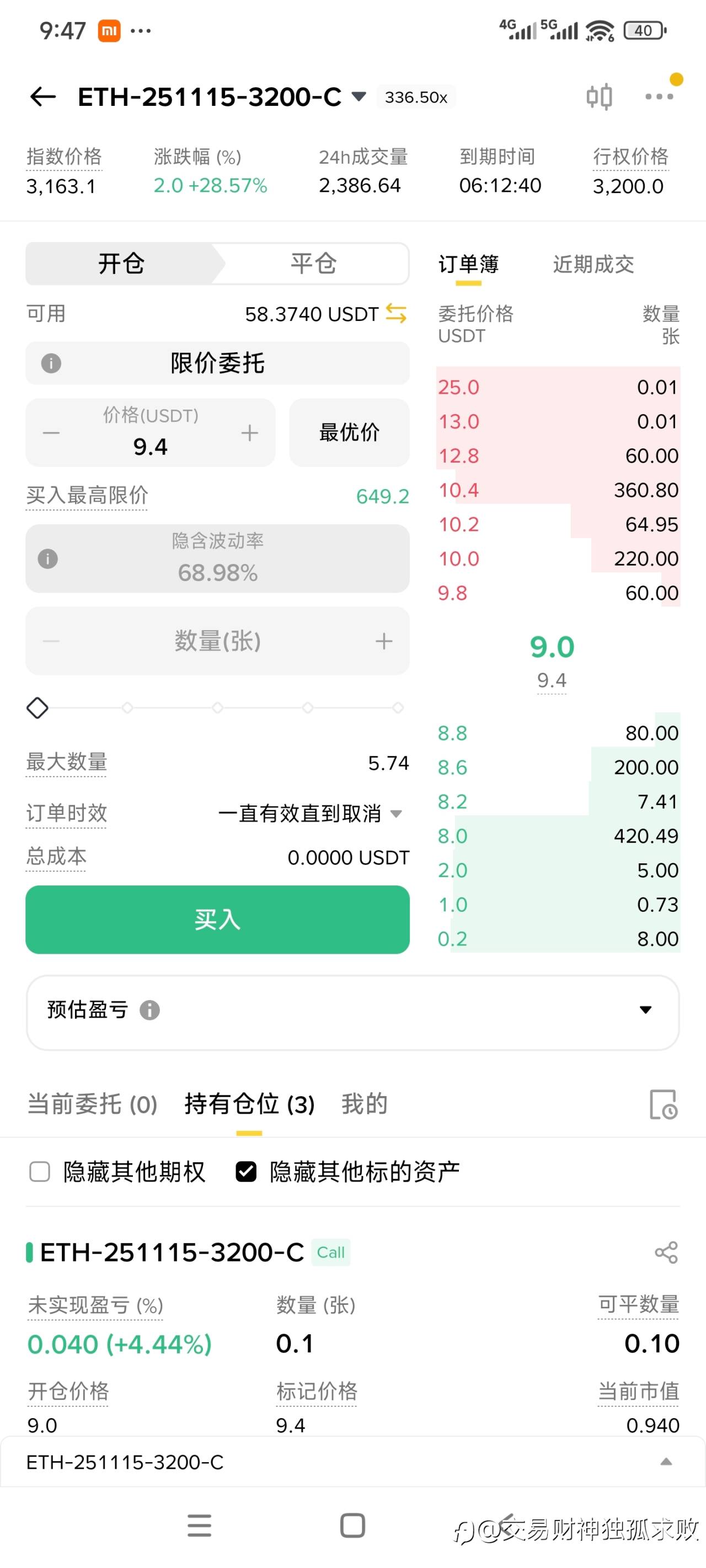 刚刚又开仓了一个期权。 风险提示:本文所述仅代表作者个人观点,不代表 Followme 的官方立场。Followme 不对内容的准确性、完整性或可靠性作出任何保证,对于基于该内容所采取的任何行为,不承担任何责任,除非另有书面明确说明。