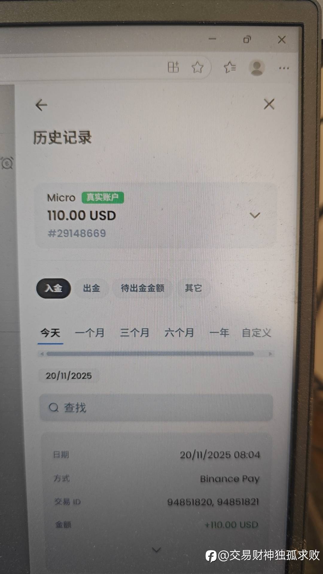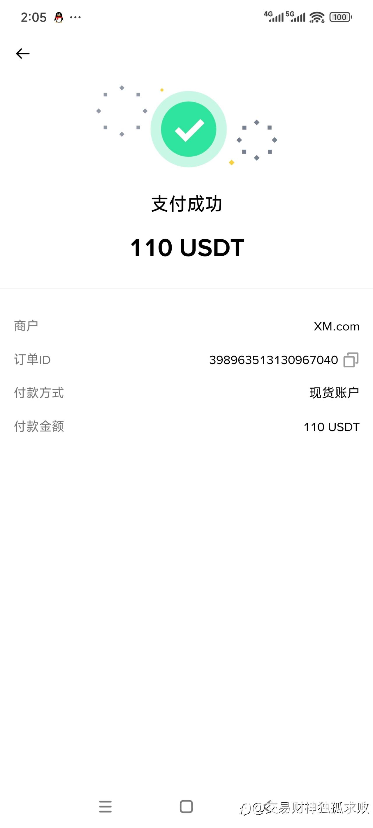 然后,我用币A支付入金110刀到XM的新开帐户。 风险提示:本文所述仅代表作者个人观点,不代表 Followme 的官方立场。Followme 不对内容的准确性、完整性或可靠性作出任何保证,对于基于该内容所采取的任何行为,不承担任何责任,除非另有书面明确说明。