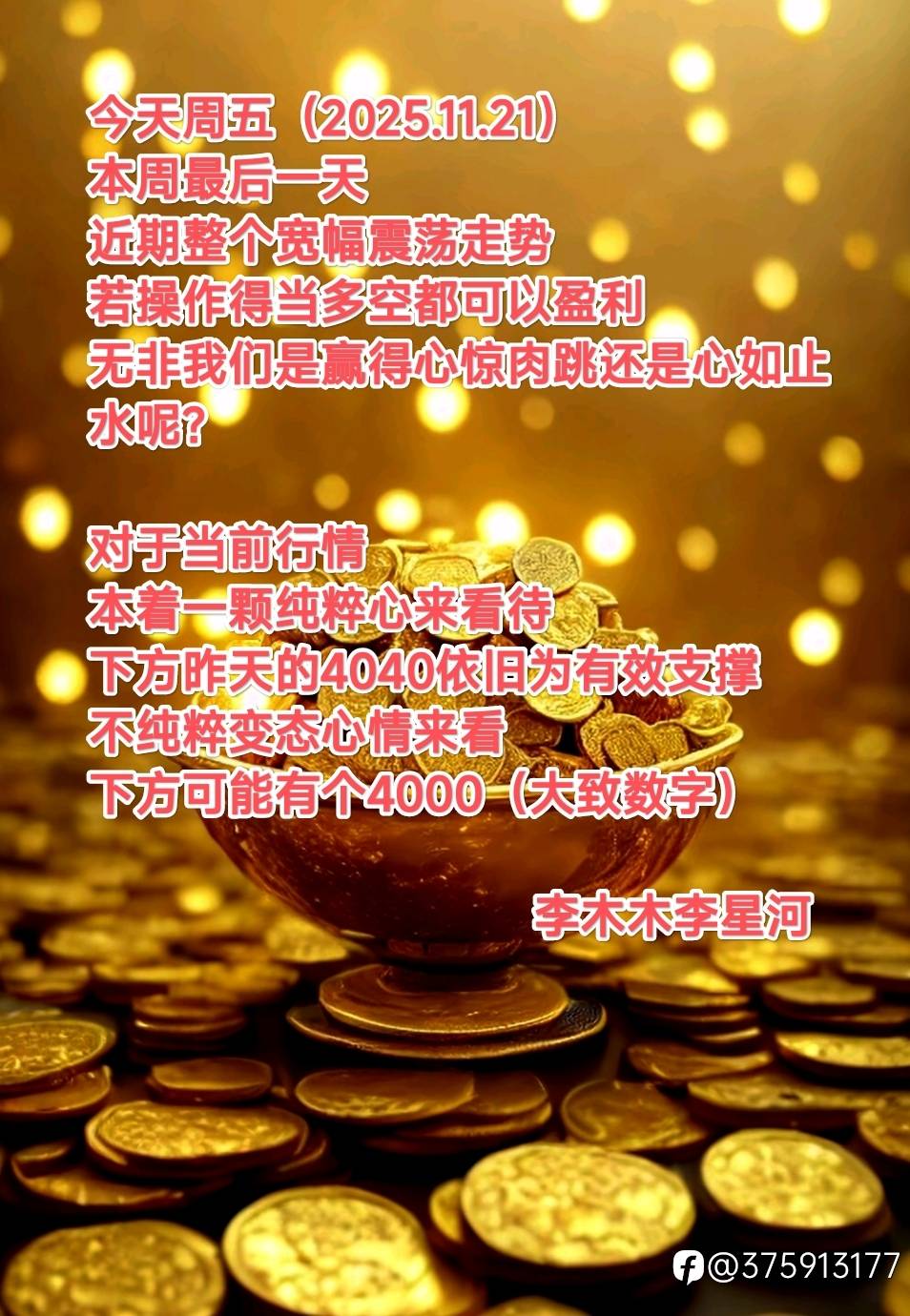 今天周五(2025.11.21) 本周最后一天 近期整个宽幅震荡走势 若操作得当多空都可以盈利 无非我们是赢得心惊肉跳还是心如止水呢? 对于当前行情 本着一颗纯粹心来看待 下方昨天的4040依旧为有效支撑 不纯粹变态心情来看 下方可能有个4000(大致数字) 风险提示:本文所述仅代表作者个人观点,不代表 Followme 的官方立场。Followme 不对内容的准确性、完整性或可靠性作出任何保证,对于基于该内容所采取的任何行为,不承担任何责任,除非另有书面明确说明。