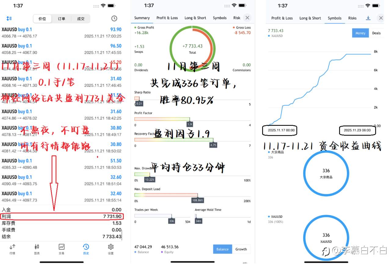 11月第三周,共5个交易日, 神经网络ea净赚7732美金, 不熬夜,不盯盘,所有行情都能跑 风险提示:本文所述仅代表作者个人观点,不代表 Followme 的官方立场。Followme 不对内容的准确性、完整性或可靠性作出任何保证,对于基于该内容所采取的任何行为,不承担任何责任,除非另有书面明确说明。