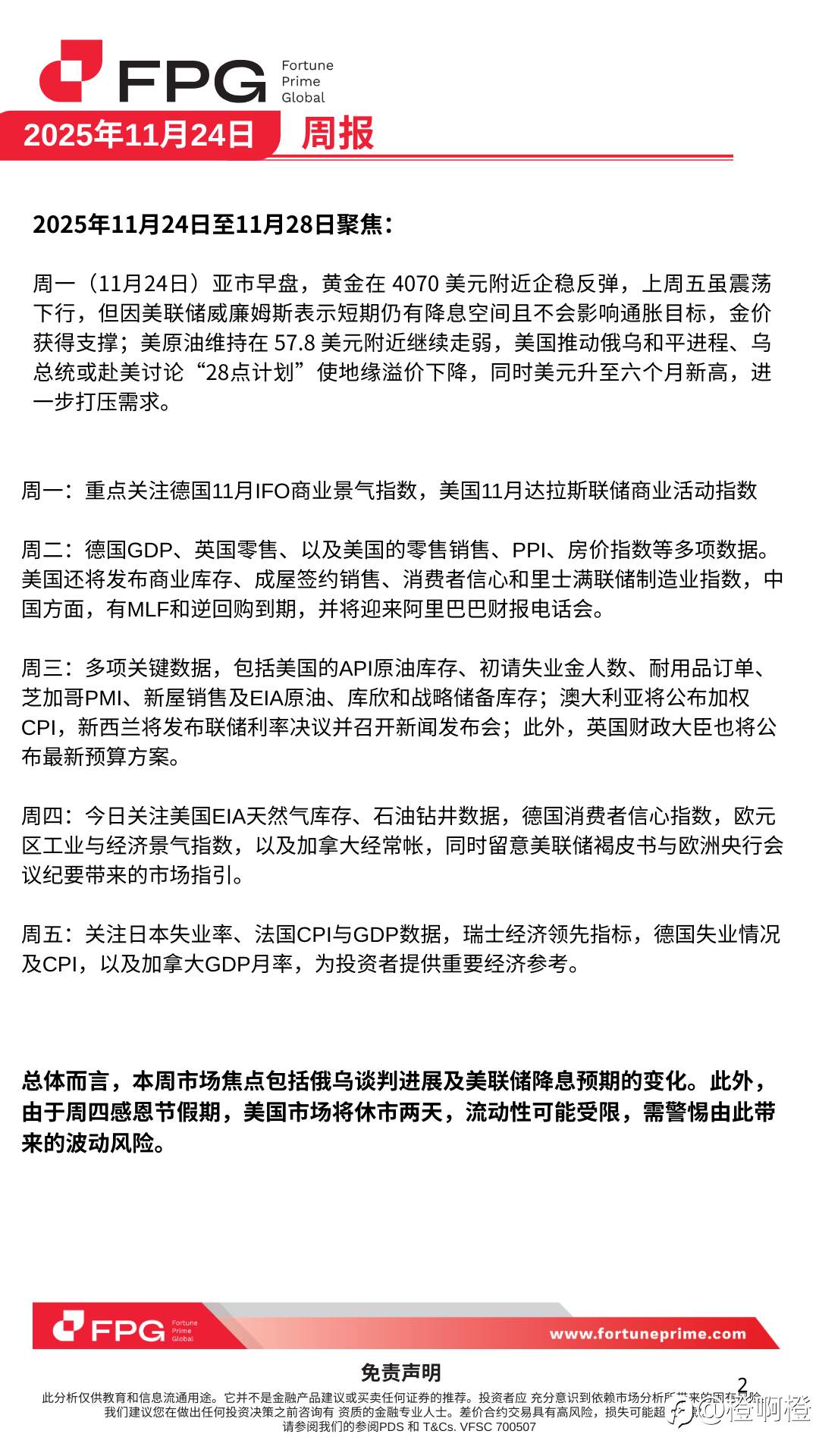 市场将持续关注俄乌谈判及美联储政策预期变化。同时,美国市场因感恩节休市两天,需注意流动性不足可能带来的波动风险。