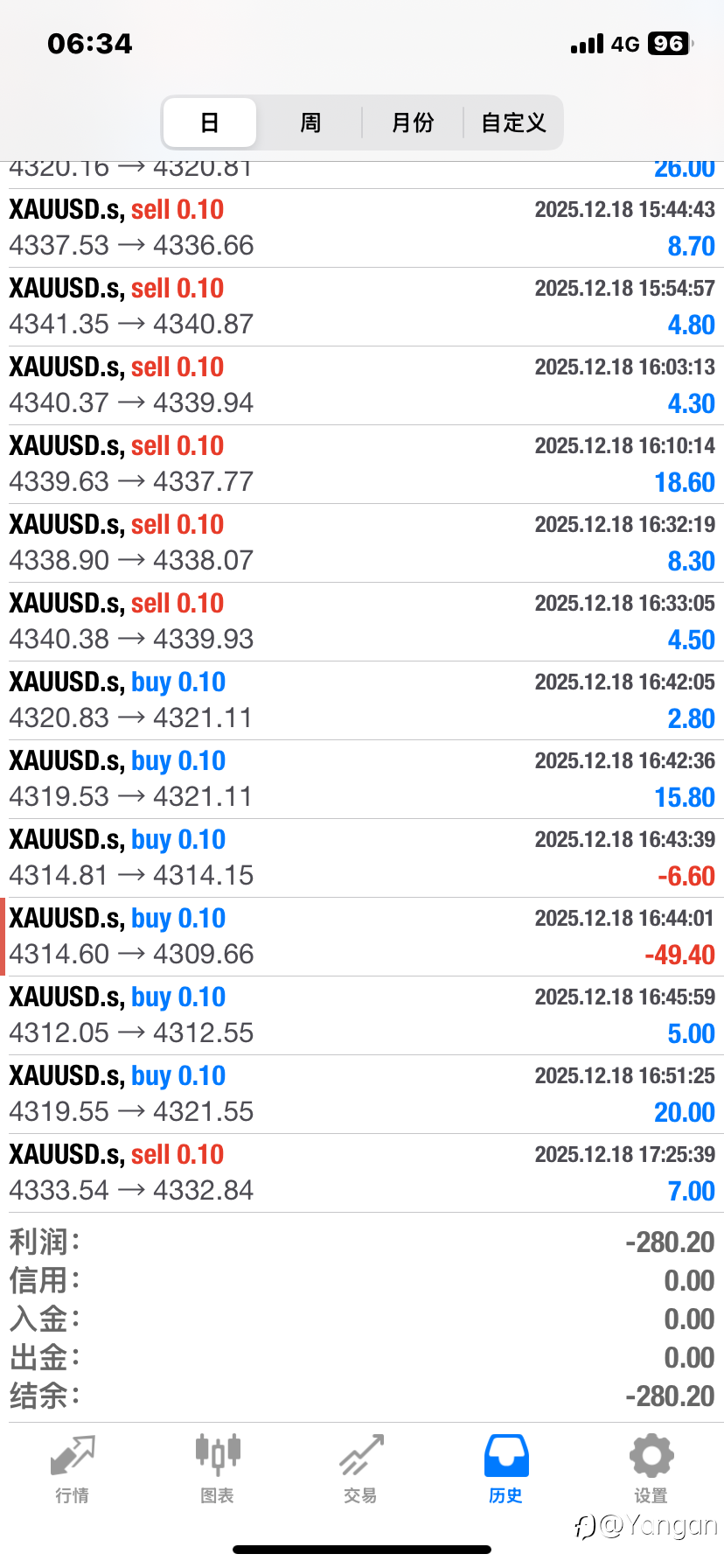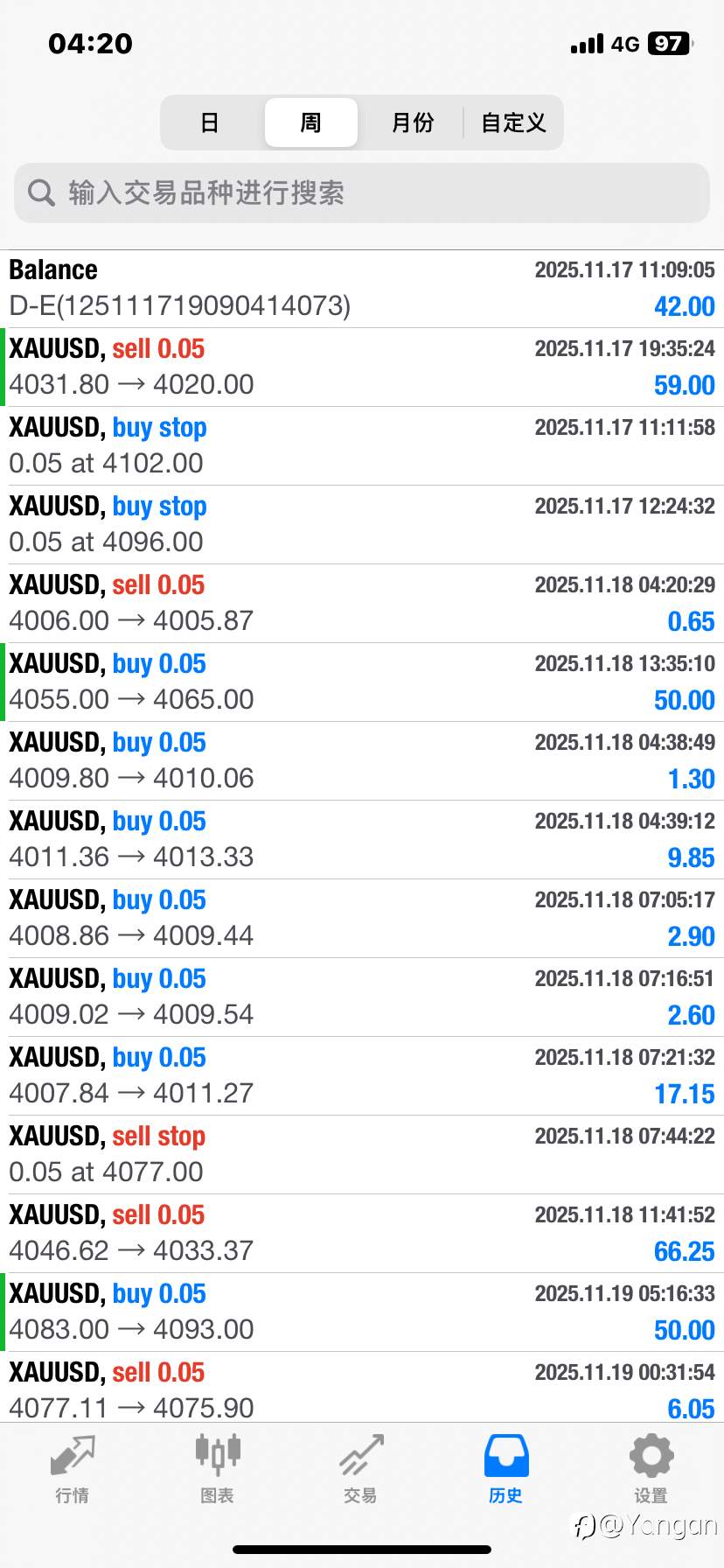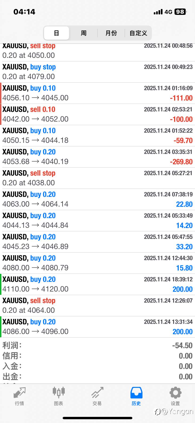 #每日交易打卡# 20251124,帐户年龄:7D。初始资金是平台赠金43美金,今日做单10单,总亏损54.5。亏损单4单,最高单子亏损269,总结亏损原因:周末两天没有做单,8点多迫不及待下单按震旦思路下单0,2手,亏损近半,手动止损。反思:不能为想做单而做单,沉住气,后面坚决执行策略。打卡第一天