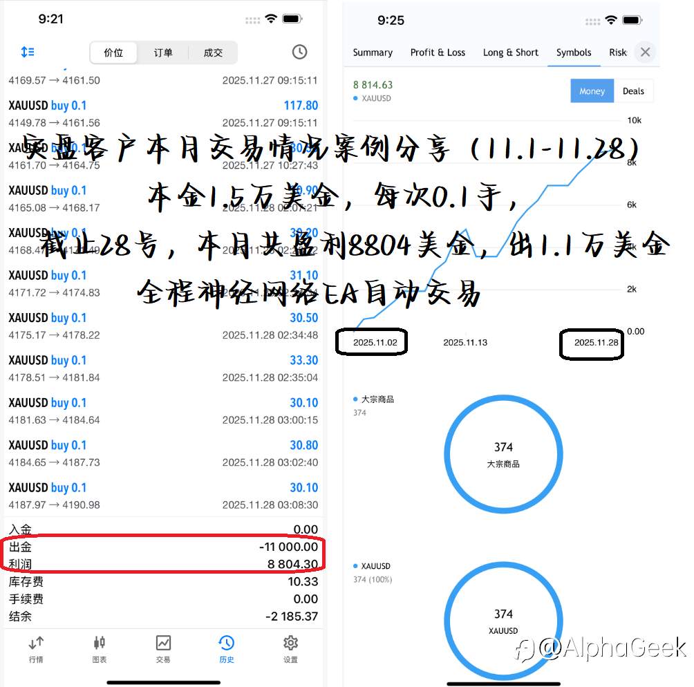 实盘客户本月交易情况案例分享: 本金1.5万美金,0.1手/笔,全程神经网络EA自动交易,11.1-11.28,共盈利8804美金, 不熬夜,不盯盘,24小时自动捕捉机会 风险提示:本文所述仅代表作者个人观点,不代表 Followme 的官方立场。Followme 不对内容的准确性、完整性或可靠性作出任何保证,对于基于该内容所采取的任何行为,不承担任何责任,除非另有书面明确说明。