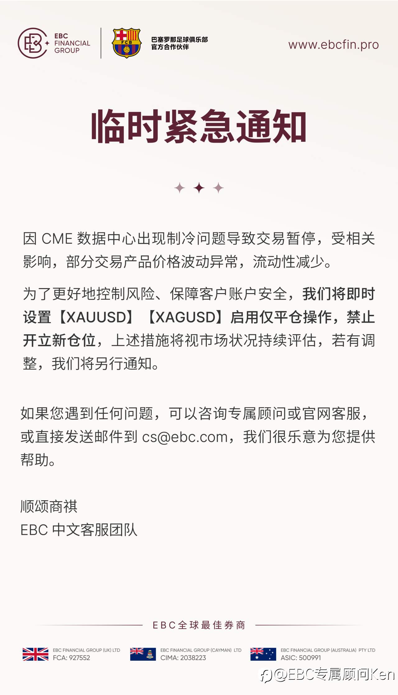 因 CME 数据中心出现制冷问题导致交易暂停,受相关影响,部分交易产品价格波动异常,流动性减少。 为了更好地控制风险、保障客户账户安全,我们将即时设置【XAUUSD】【XAGUSD】启用仅平仓操作,禁止开立新仓位,上述措施将视市场状况持续评估,若有调整,我们将另行通知。 风险提示:本文所述仅代表作者个人观点,不代表 Followme 的官方立场。Followme 不对内容的准确性、完整性或可靠性作出任何保证,对于基于该内容所采取的任何行为,不承担任何责任,除非另有书面明确说明。