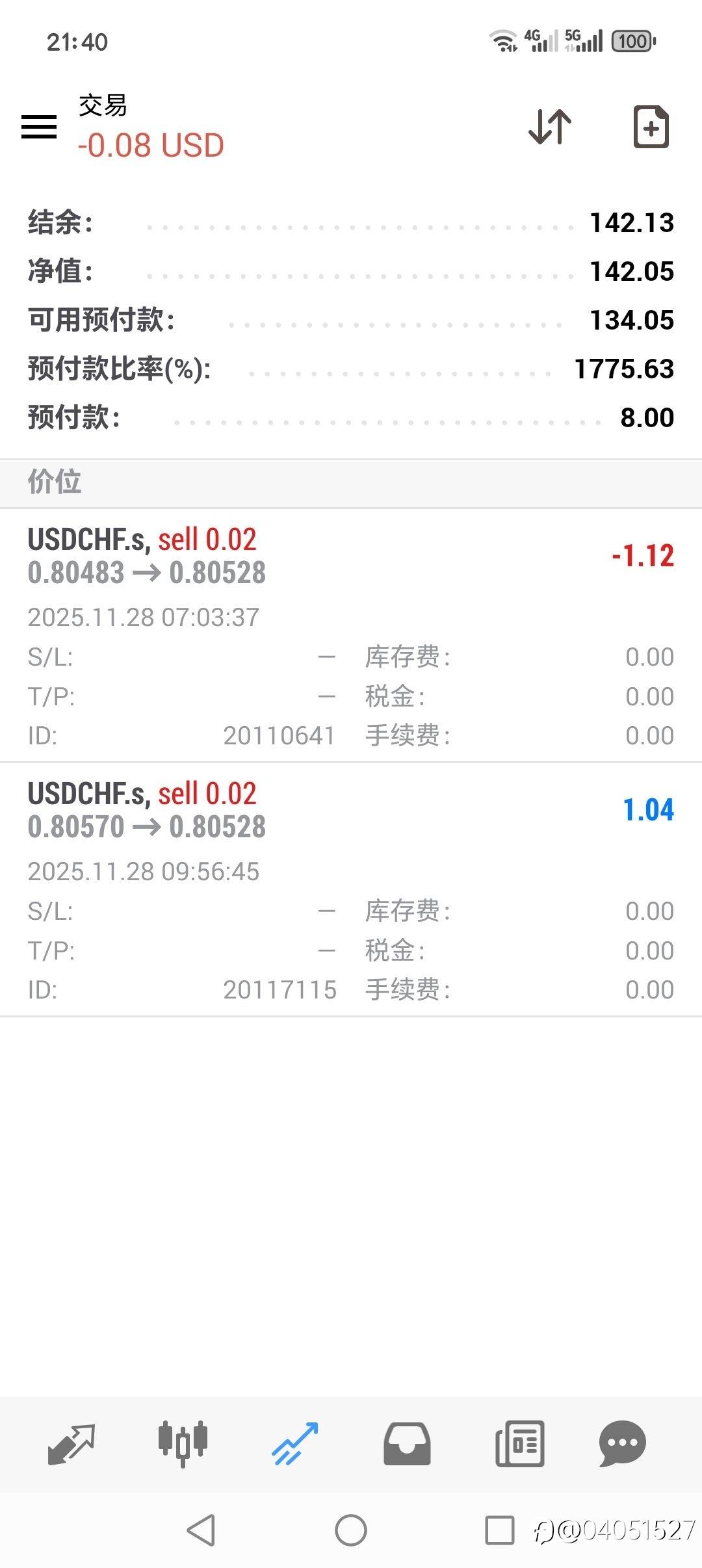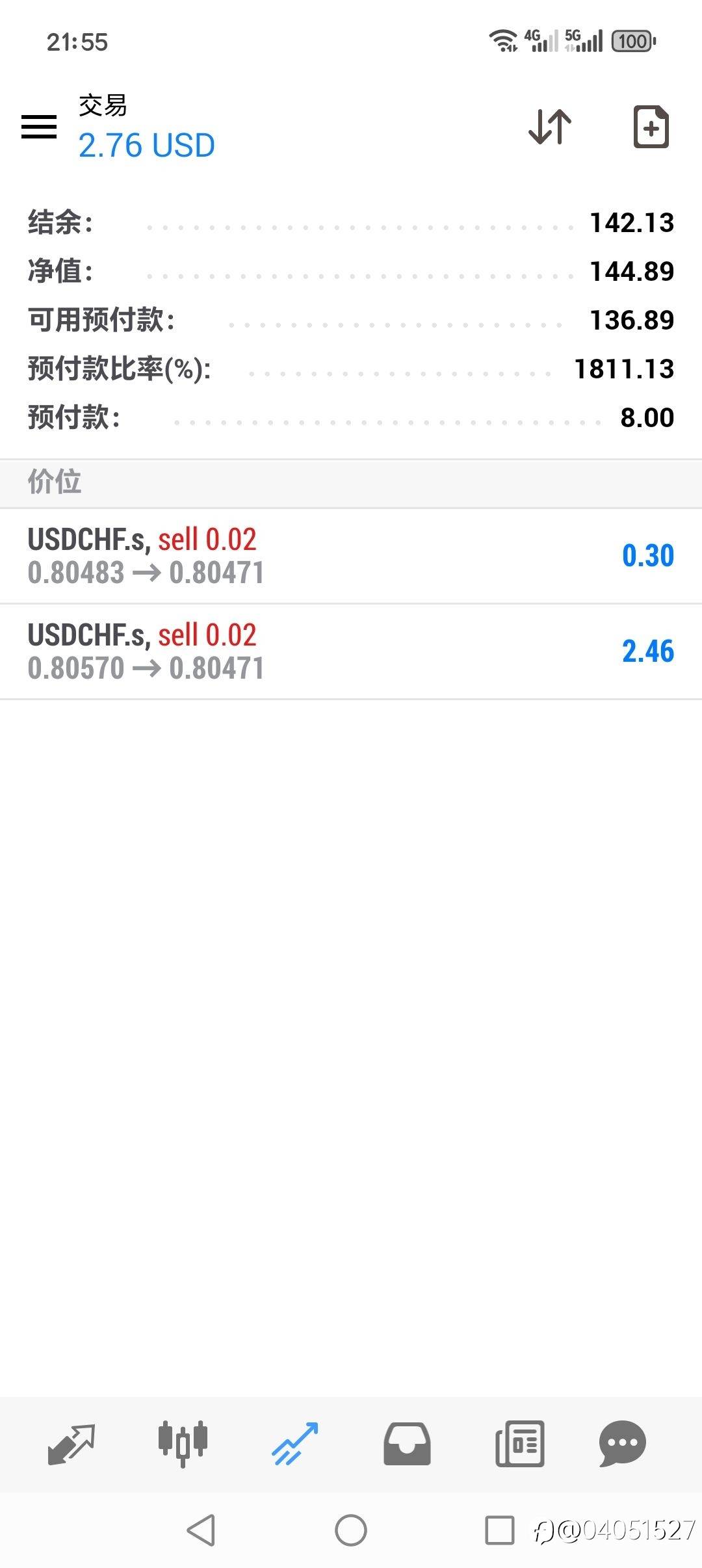 #USD/CHF#今天又冲动了一把,止盈,睡觉 风险提示:本文所述仅代表作者个人观点,不代表 Followme 的官方立场。Followme 不对内容的准确性、完整性或可靠性作出任何保证,对于基于该内容所采取的任何行为,不承担任何责任,除非另有书面明确说明。