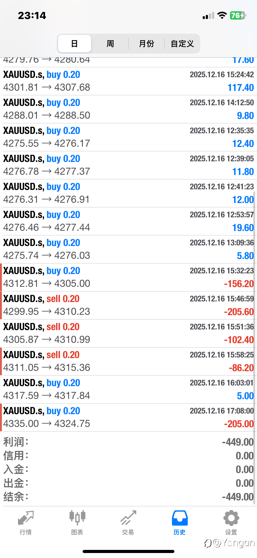 #每日交易打卡# 20251128,帐户年龄:11D。今日做单13单,盈利10单,最高盈利单400,亏损3单,最高亏损183。合计总盈利1106。深刻检讨:亏损3单都是做震荡思路,说好不做震荡,却还是做了,吸取教训。后面波动大,机会总算是来了的。下个月继续加油。打卡第5天