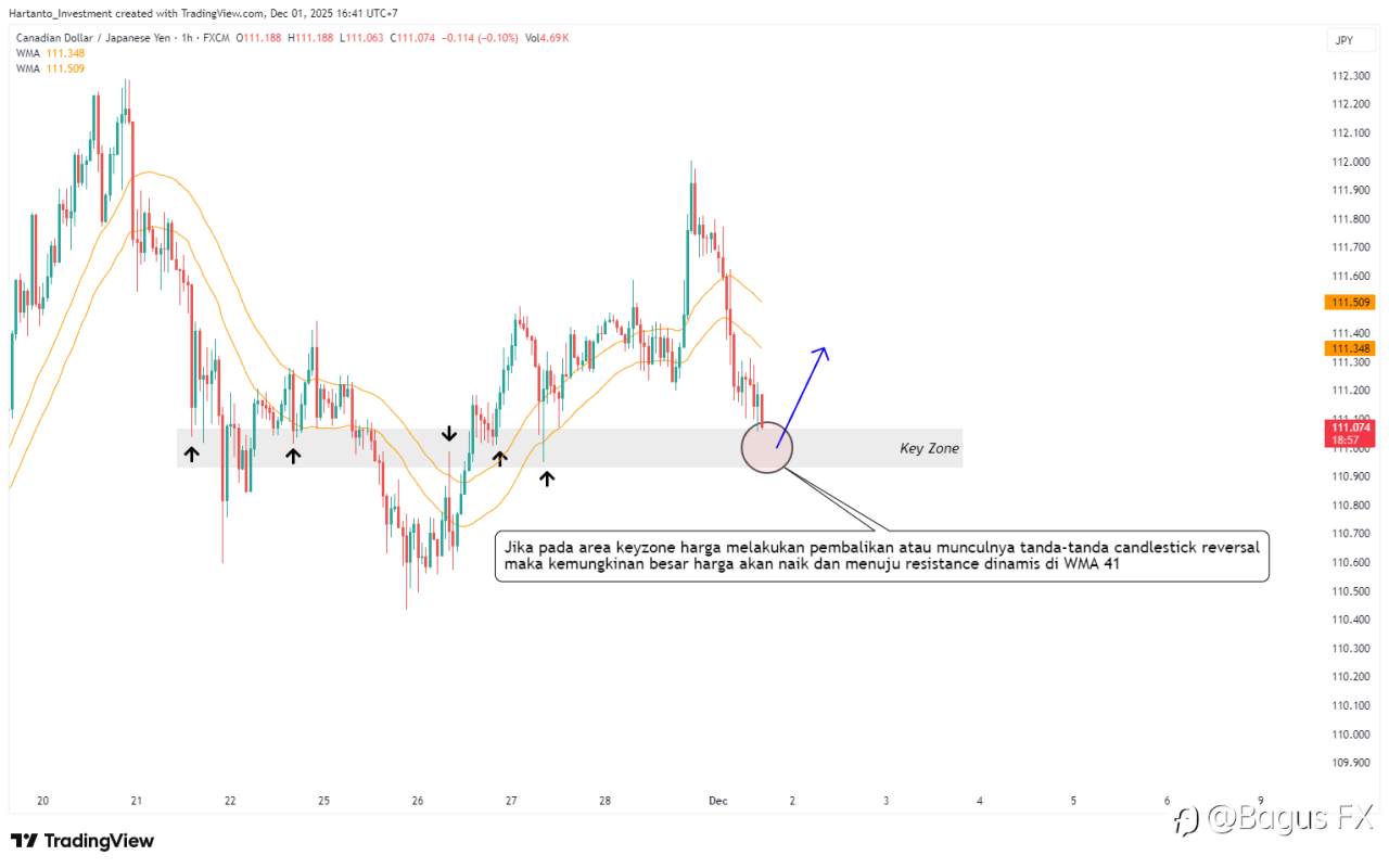 Hari ini untuk CADJPY, simpel dan juga mudah-mudahan akurat saat ini juga terlihat harga pada area keyzone dan jika memang ada pertanda candlestick reversal pada area tersebut maka kemungkinan besar harga akan naik menuju resistance dinamis di WMA 41