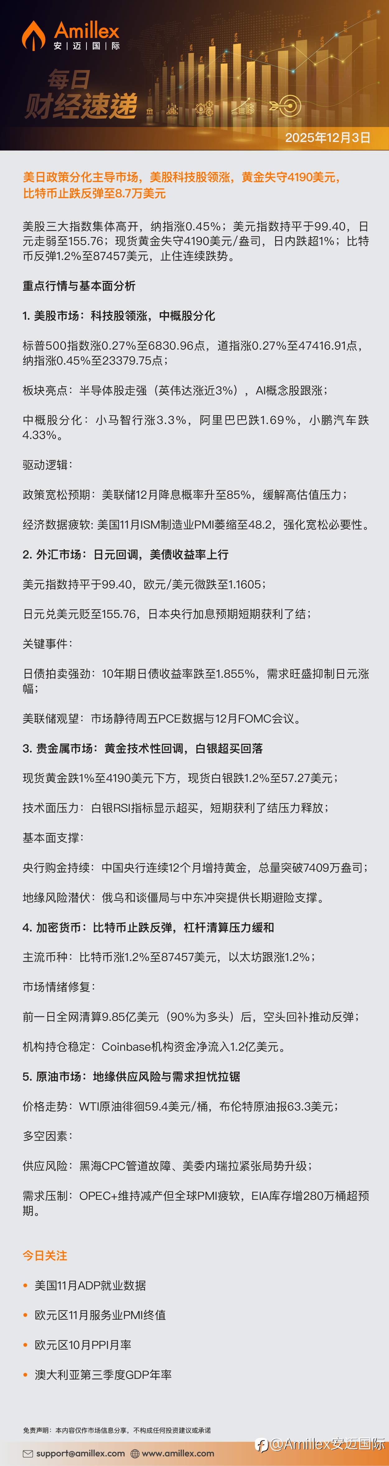 Amillex每日汇评:美日政策分化主导市场,美股科技股领涨,黄金失守4190美元,比特币止跌反弹至8.7万美元 风险提示:本文所述仅代表作者个人观点,不代表 Followme 的官方立场。Followme 不对内容的准确性、完整性或可靠性作出任何保证,对于基于该内容所采取的任何行为,不承担任何责任,除非另有书面明确说明。