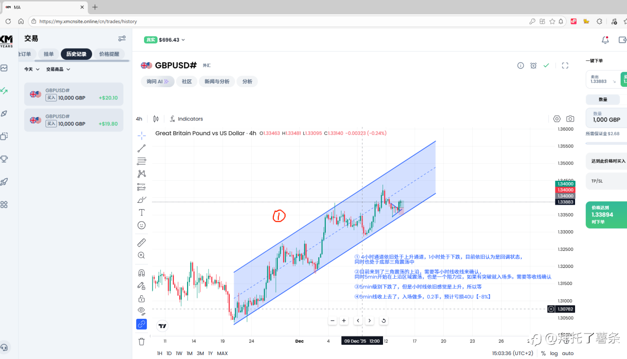 2.美日来到了上方阻力位148.5,进了1手的空单,但是随后连续上拉,最后在小时回调时清仓了这个单子。有效突破148.5后其实就会去挑战前高152,若这样,账户将会承受2000刀左右的浮亏(账户50%),风险太高,是绝对不允许的。随后同时将正相关的瑞日0.5手空单获利出场了。