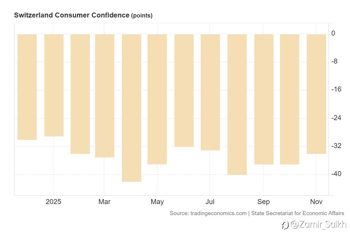 Switzerland’s consumer confidence index rose to -34 in Nov 2025, improving from -37 in October — the highest level since July! 🚀