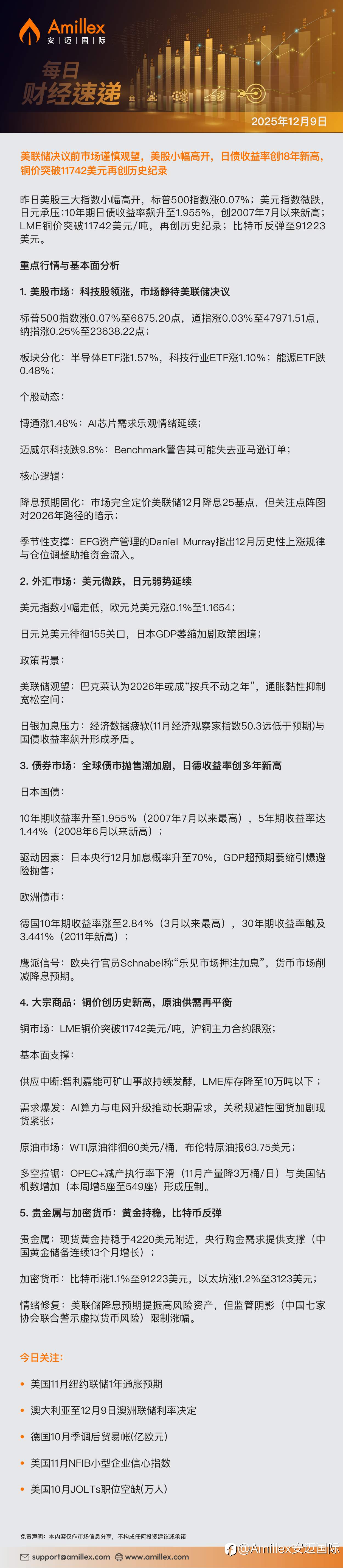 Amillex每日汇评:美联储决议前市场谨慎观望,美股小幅高开,日债收益率创18年新高,铜价突破11742美元再创历史纪录 风险提示:本文所述仅代表作者个人观点,不代表 Followme 的官方立场。Followme 不对内容的准确性、完整性或可靠性作出任何保证,对于基于该内容所采取的任何行为,不承担任何责任,除非另有书面明确说明。