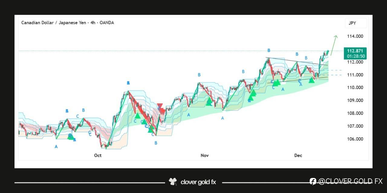 CADJPY is showing a clean bullish structure where price has completed a corrective ABC pattern within the broader wave 4 and has now broken above the descending trendline resistance that capped previous upside attempts. This breakout from the consolidation zone, supported by strong rejection from the lower boundary of the correction, signals that buyers are gaining momentum and preparing for the next impulsive phase. The grey zone highlights the key retest area where bulls are stepping back in, and as long as price holds above this region, the market is positioned to advance toward the anticipated wave 5 continuation. Overall, the structure reflects strength, trend alignment, and a potential bullish extension as market sentiment shifts firmly in favor of buyers.