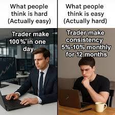 Me, a realistic trader: "Cari broker yang withdrawnya nggak ribet, dan cari trading plan yang bikin tidur nyenyak kalau lagi floating loss."