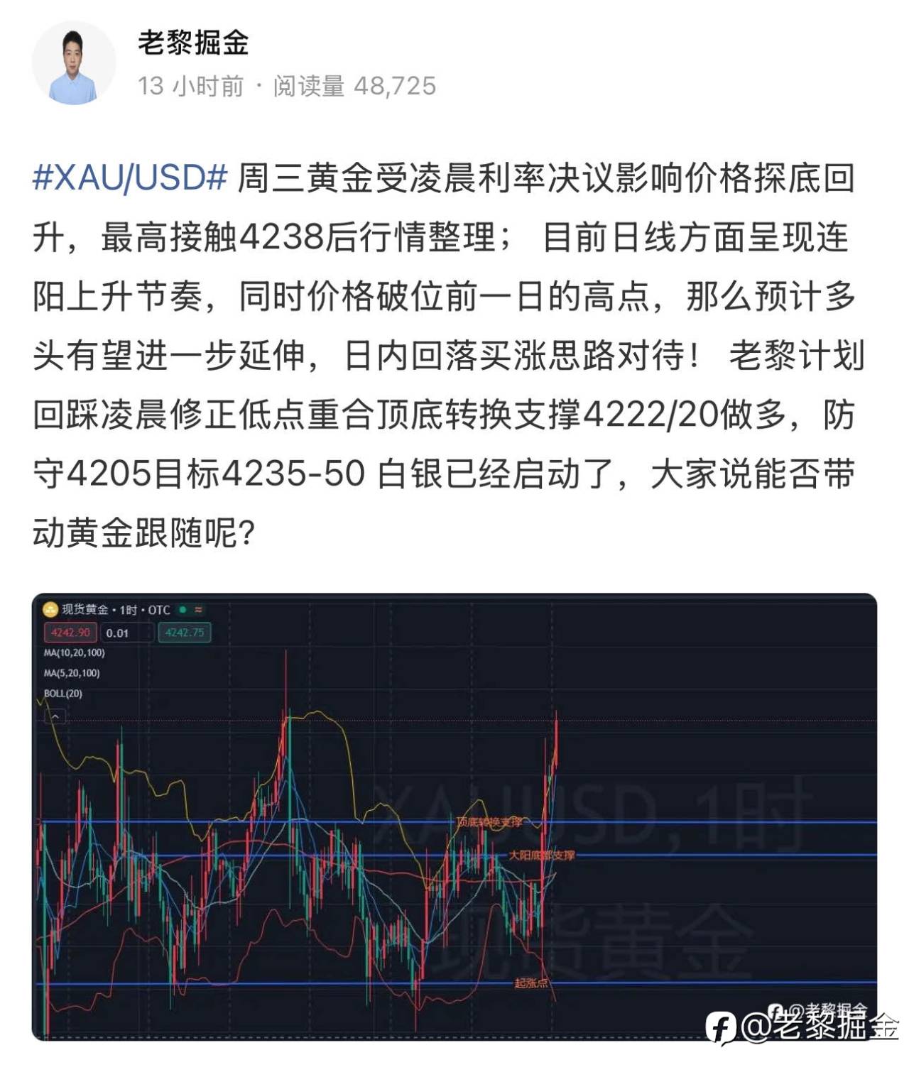 #XAU/USD# 早盘黄金冲高回落最低接触4204一线反弹整理,老黎布局多单遗憾雷锋损离场;