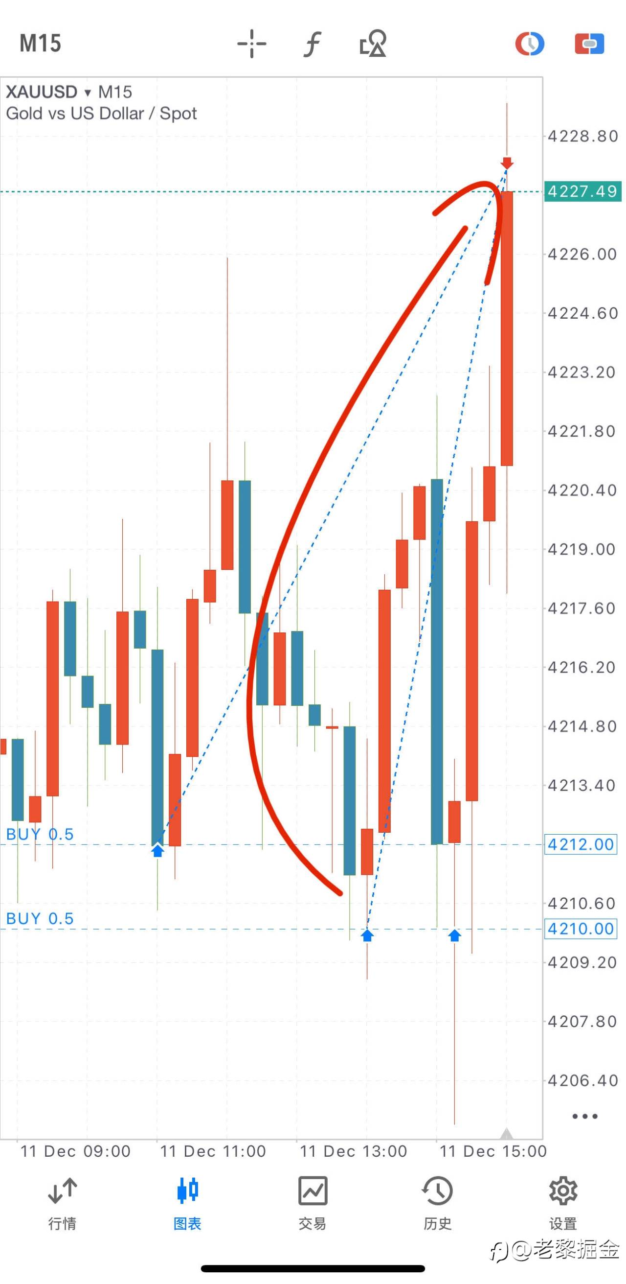 目前美盘价格探底回升呈现震荡反弹格局,既然确定回落买涨博弈多头再度延伸思路,晚间老黎4212/10多单二次进场现价4228已顺利拿下18点行情挽回早间损失获利减仓;