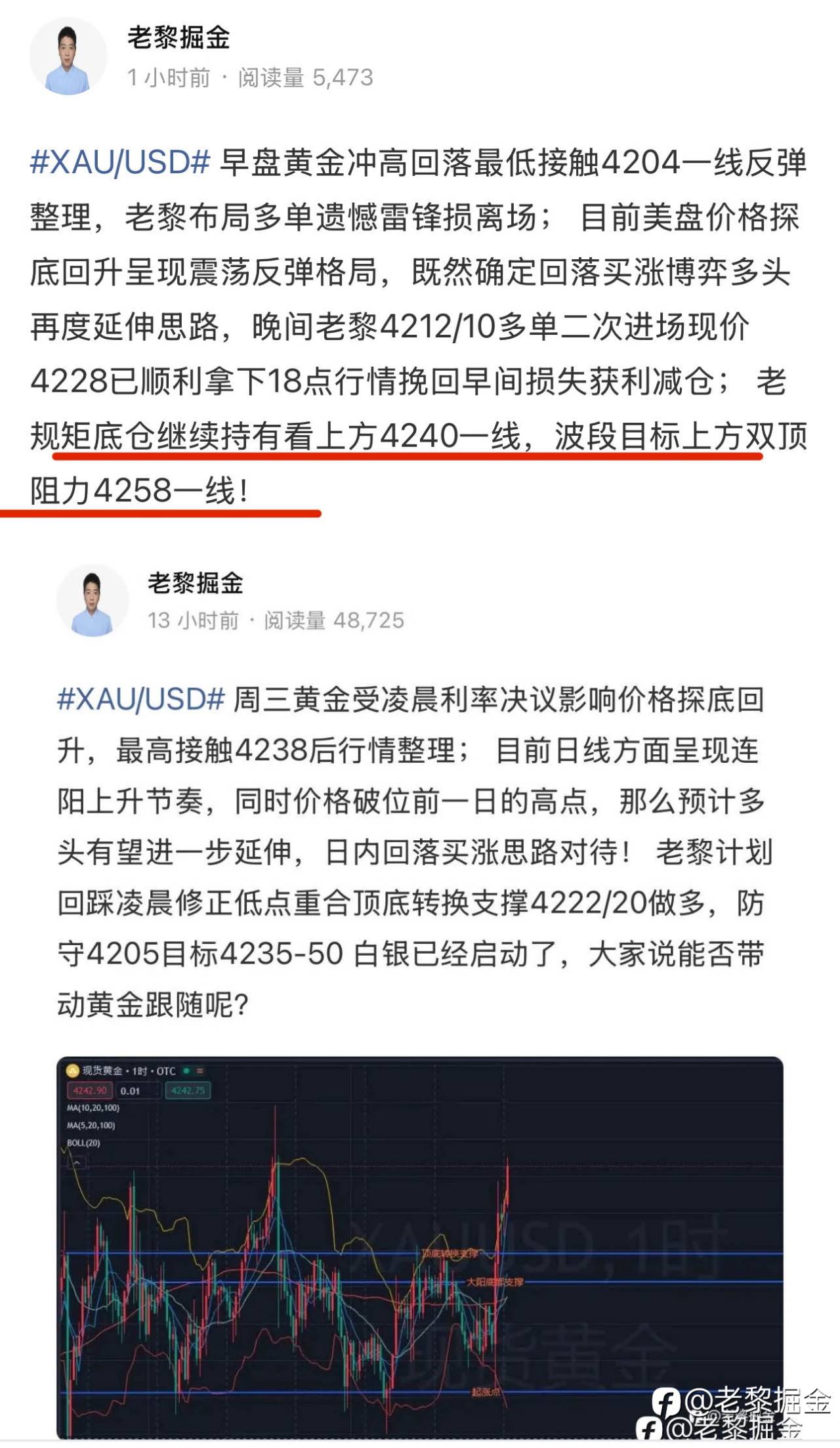 美盘黄金受失业金数据影响价格持续反弹上升,老黎晚间4212/10布局多单如期兑换短线4240目标拿下30点行情,日内2次多单1盈1损综合收割33点行情入账,4210底仓多波段目标上方双顶阻力4258一线不变!
